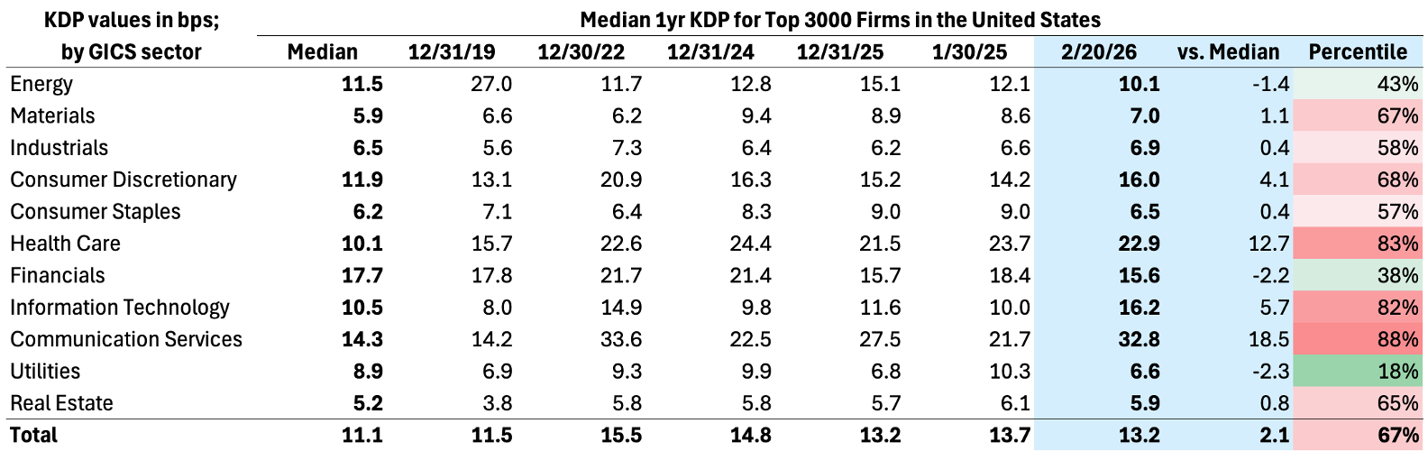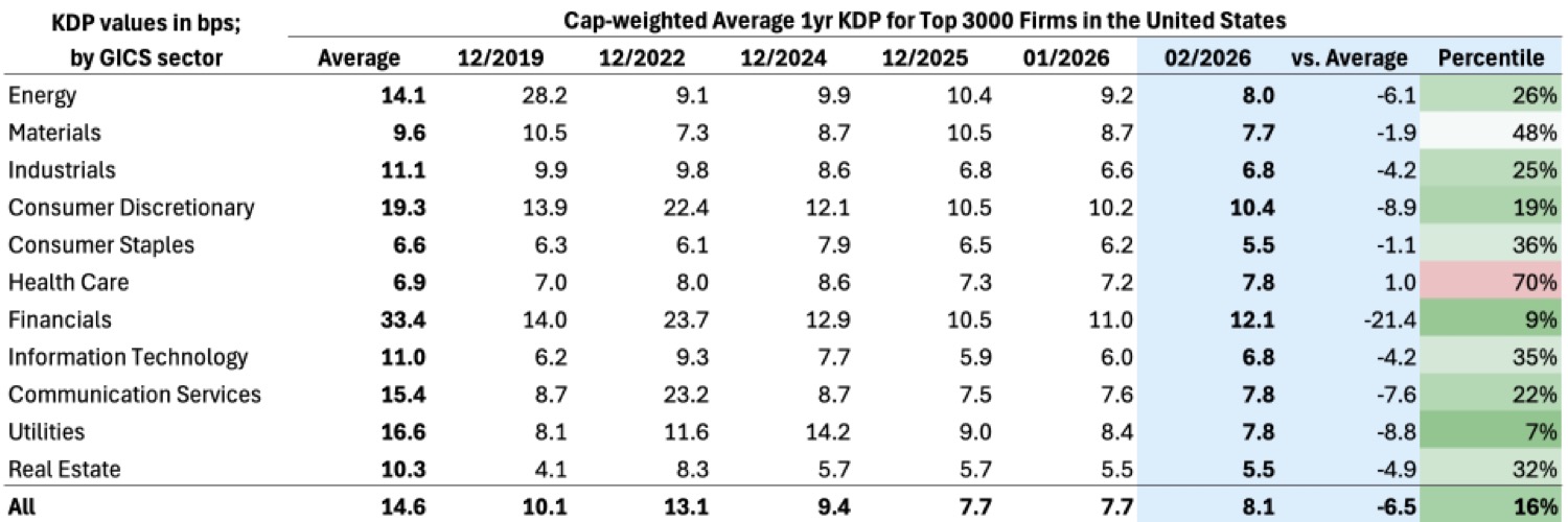 Last month’s newsletter[2] highlighted a structural fragility in Information Technology, visible in KRIS as one of the widest gaps between median KDP and cap-weighted KDP. That is an important metric: it implies that index-level stability is being propped up by a small set of very large “winner” names, while the typical IT firm is meaningfully weaker. That dispersion matters because it changes how stress propagates: