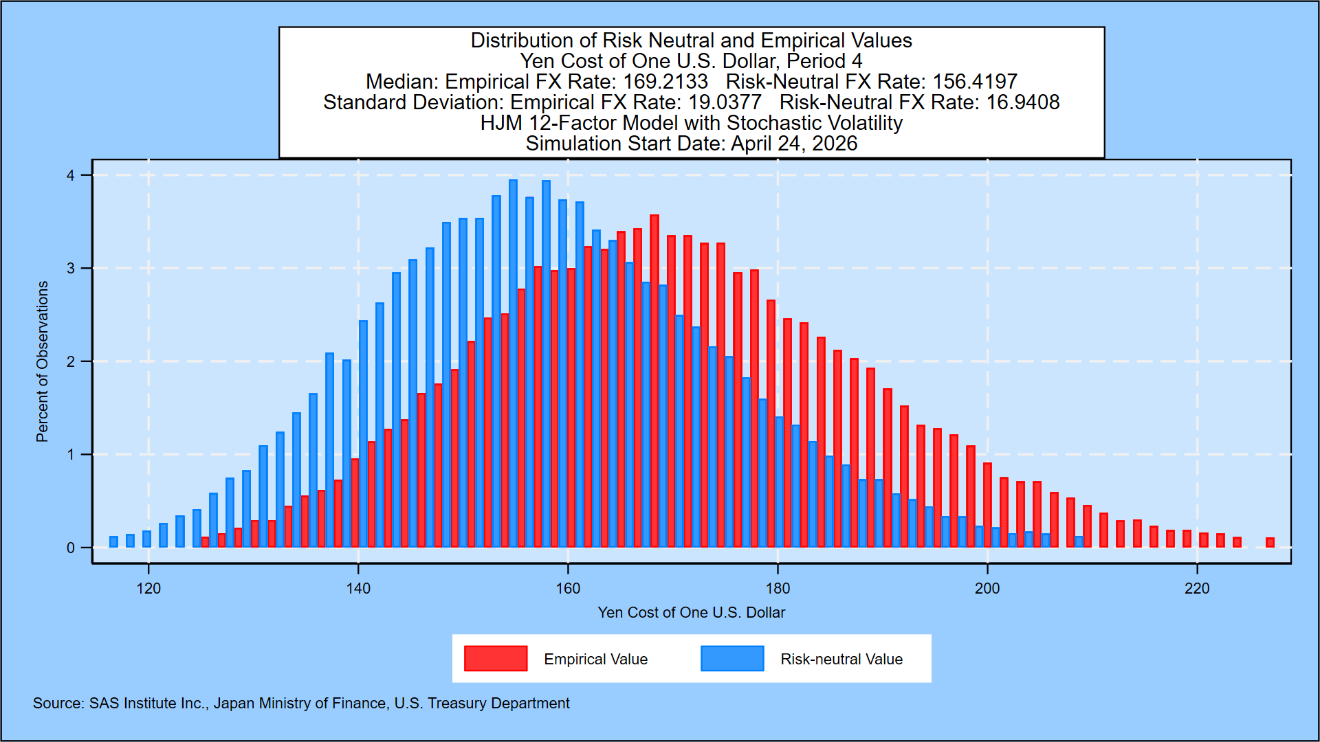 The SAS HJM++© methodology is based on five decades of research by Prof. Robert Jarrow. Using the no-arbitrage conditions of Heath, Jarrow and Morton [1992] and foreign exchange rate no-arbitrage conditions from Amin and Jarrow [1992], foreign exchange rates and government yields in major markets are simulated jointly. The simulation is based on daily movements in government yields and foreign exchange rates since January 2, 1962. The resulting distribution of the yen-U.S. dollar exchange rate one year forward is shown in this graph: