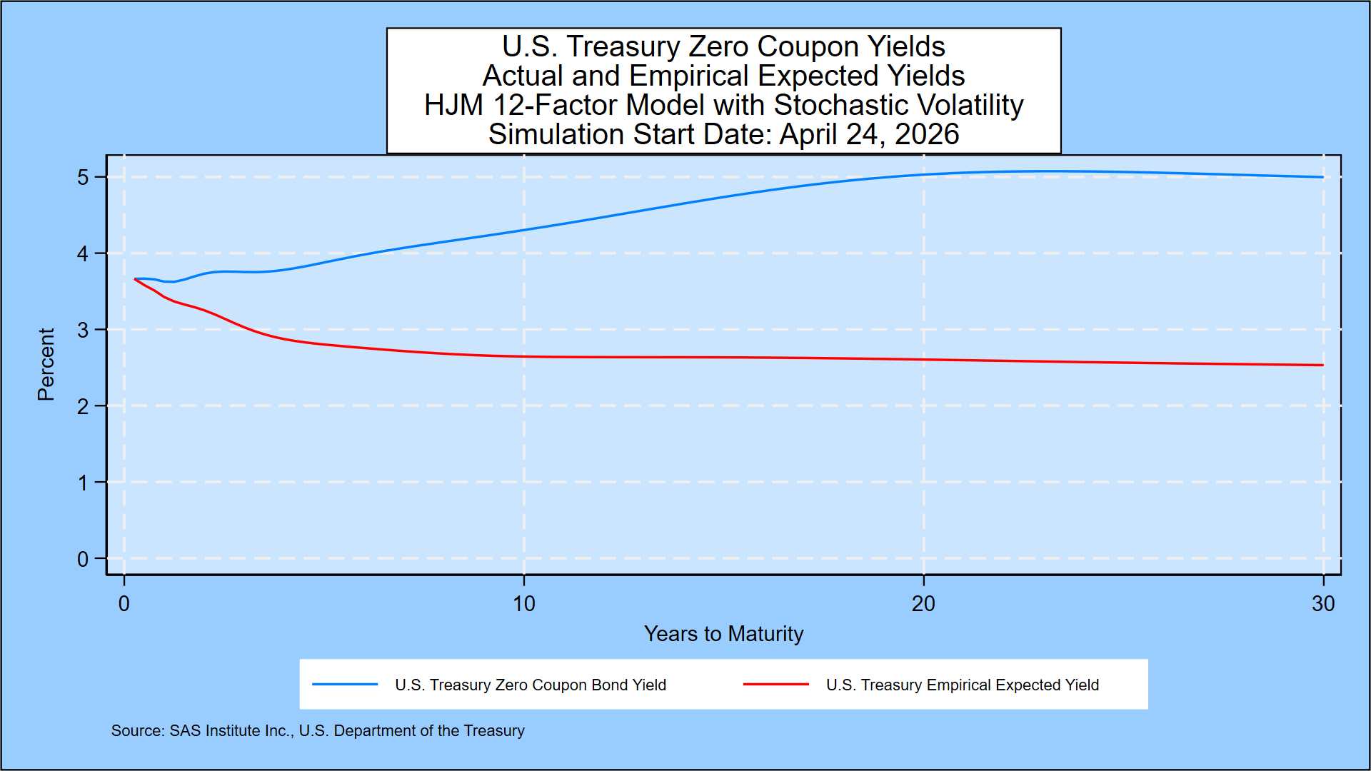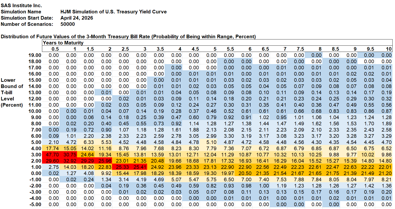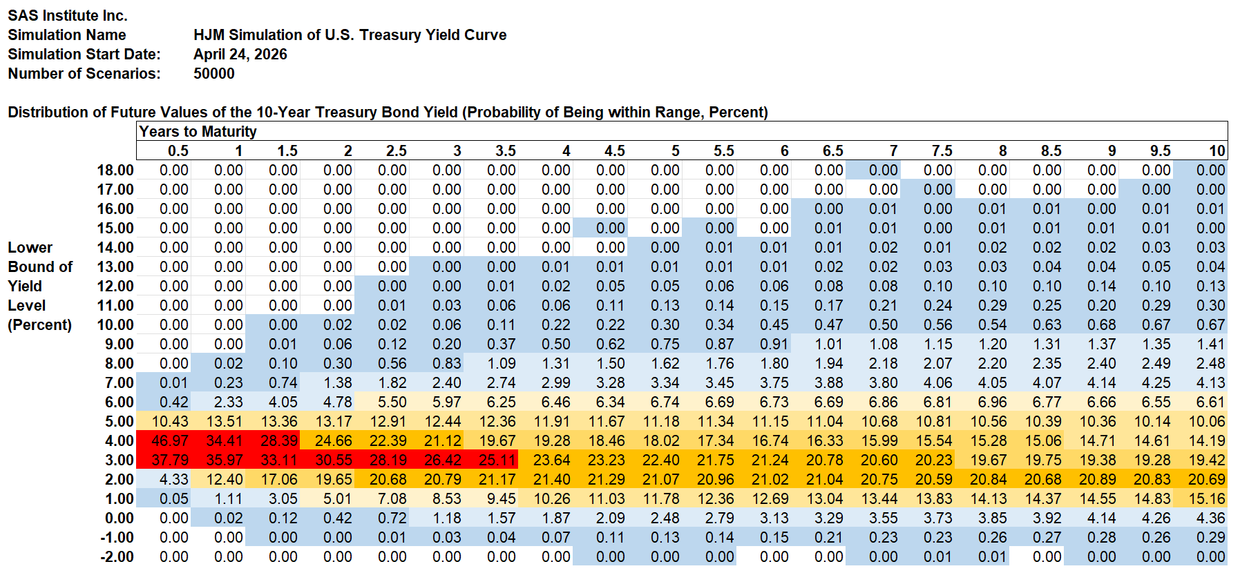 The Treasury yield probabilities are derived using the same methodology that SAS Institute Inc. recommends to its KRIS® and SAS ALM/Kamakura Risk Manager® clients. A moderately technical explanation is given later in the appendix, but we summarize it in plain English first.