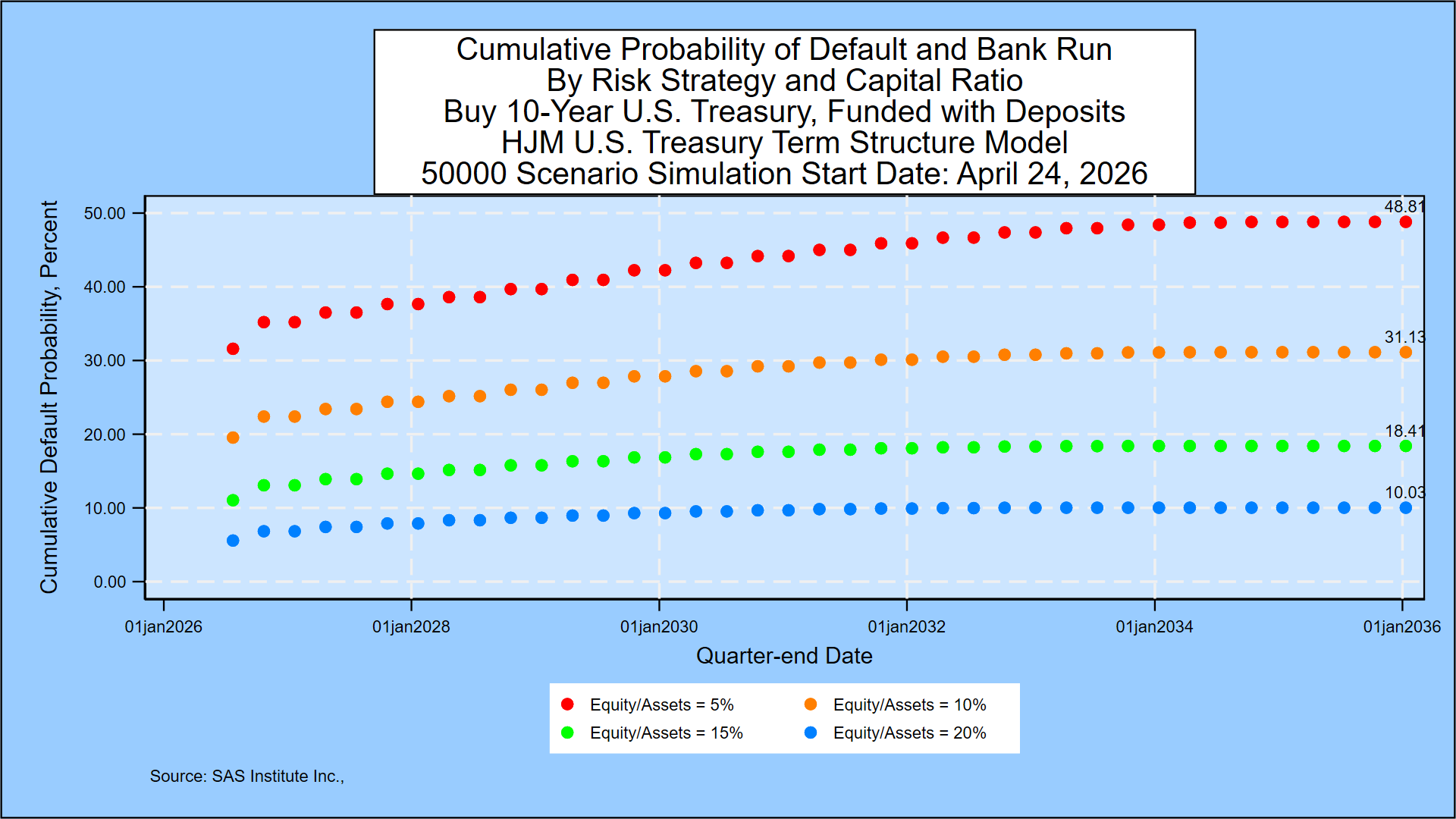 The graph below shows the cumulative 10-year probabilities of failure for each of the 4 possible capital ratios when the asset’s maturity is 10 years. For the 5 percent case, that default probability is 48.81%, compared to 48.70% from four weeks ago.