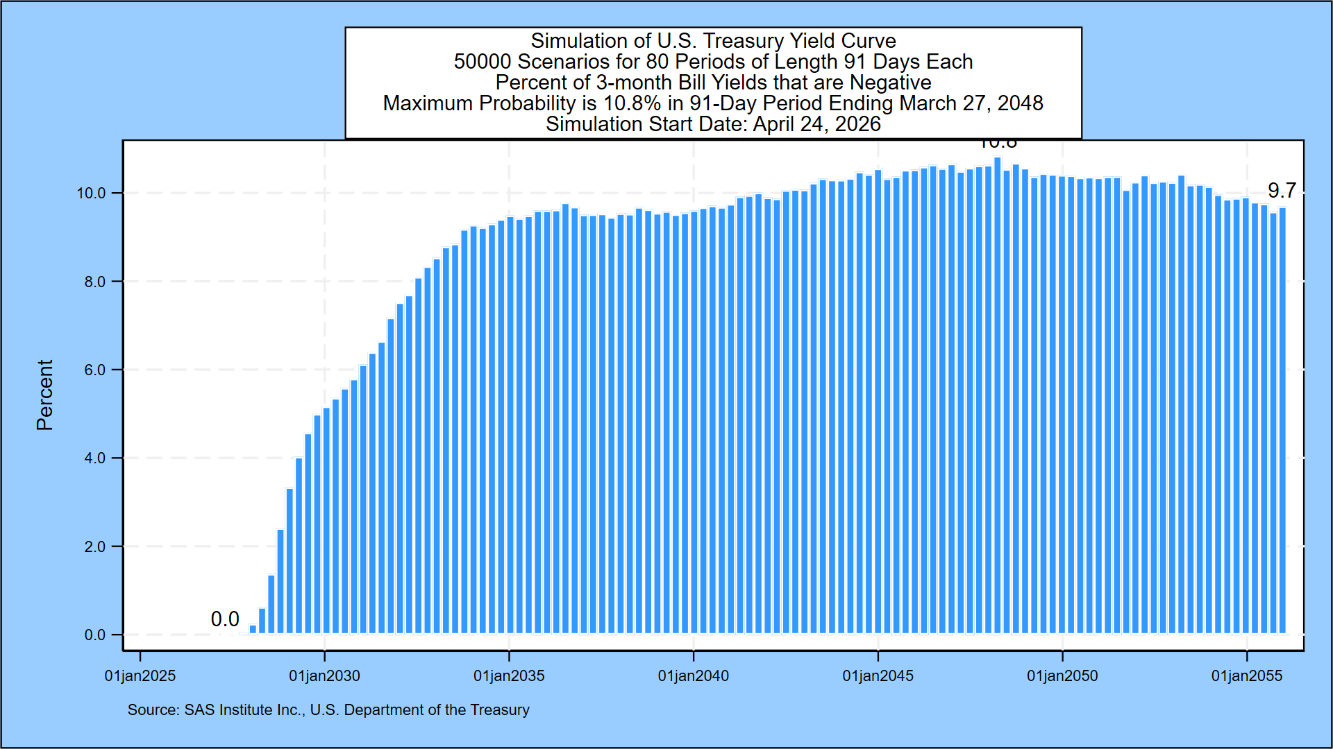 The next graph describes the probability of negative 3-month Treasury bill rates for all but the first 3 months of the next three decades. The probability of negative rates starts near zero and then peaks at 10.8% in the 91-day period ending March 27, 2048.