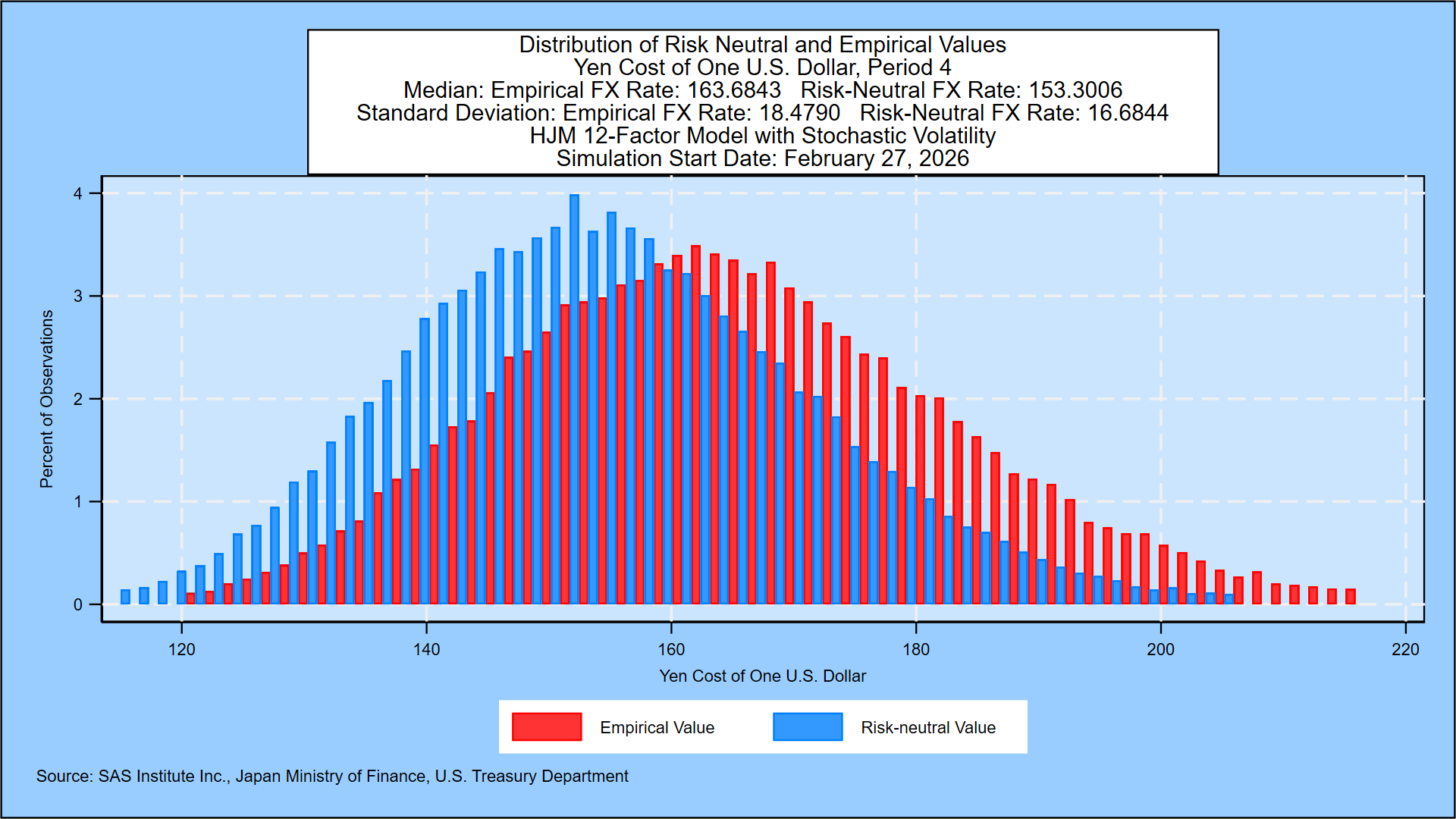 The SAS HJM++© methodology is based on five decades of research by Prof. Robert Jarrow. Using the no-arbitrage conditions of Heath, Jarrow and Morton [1992] and foreign exchange rate no-arbitrage conditions from Amin and Jarrow [1992], foreign exchange rates and government yields in major markets are simulated jointly. The simulation is based on daily movements in government yields and foreign exchange rates since January 2, 1962. The resulting distribution of the yen-U.S. dollar exchange rate one year forward is shown in this graph: