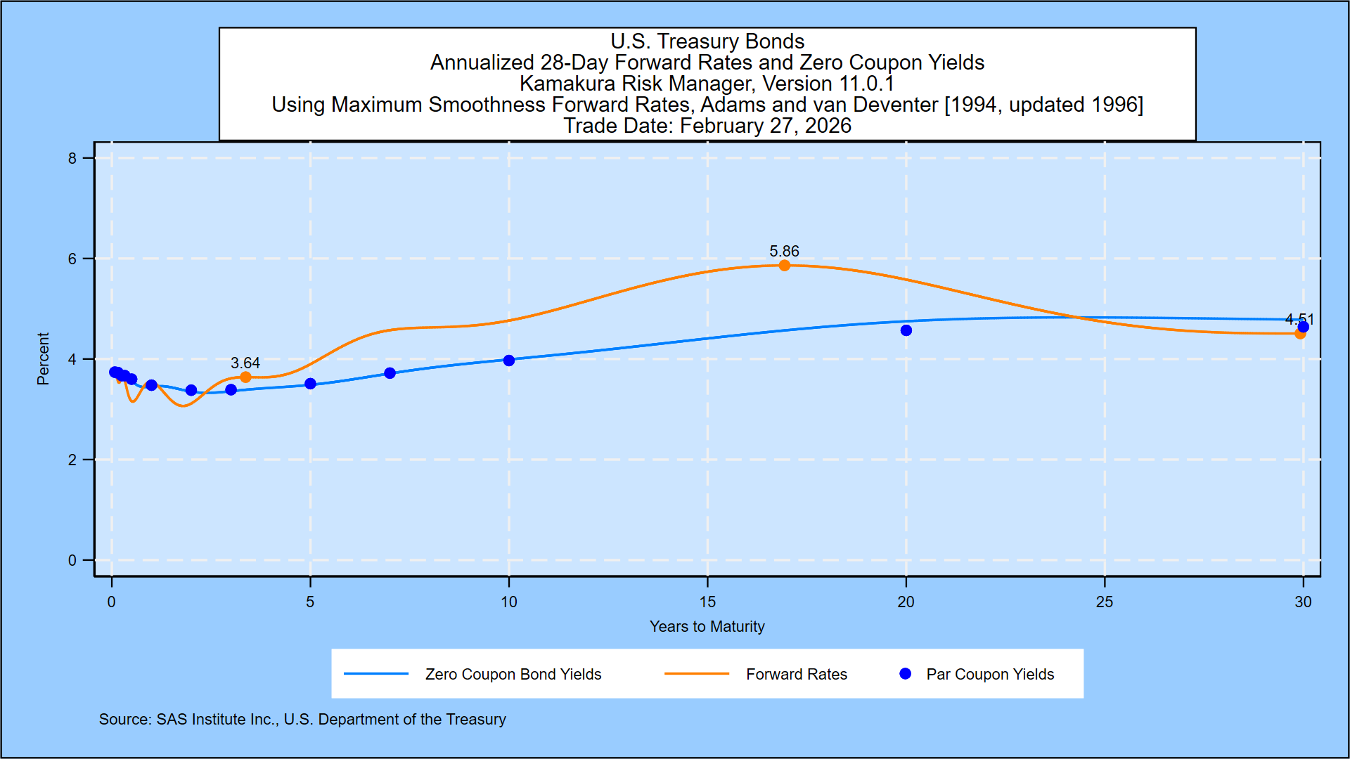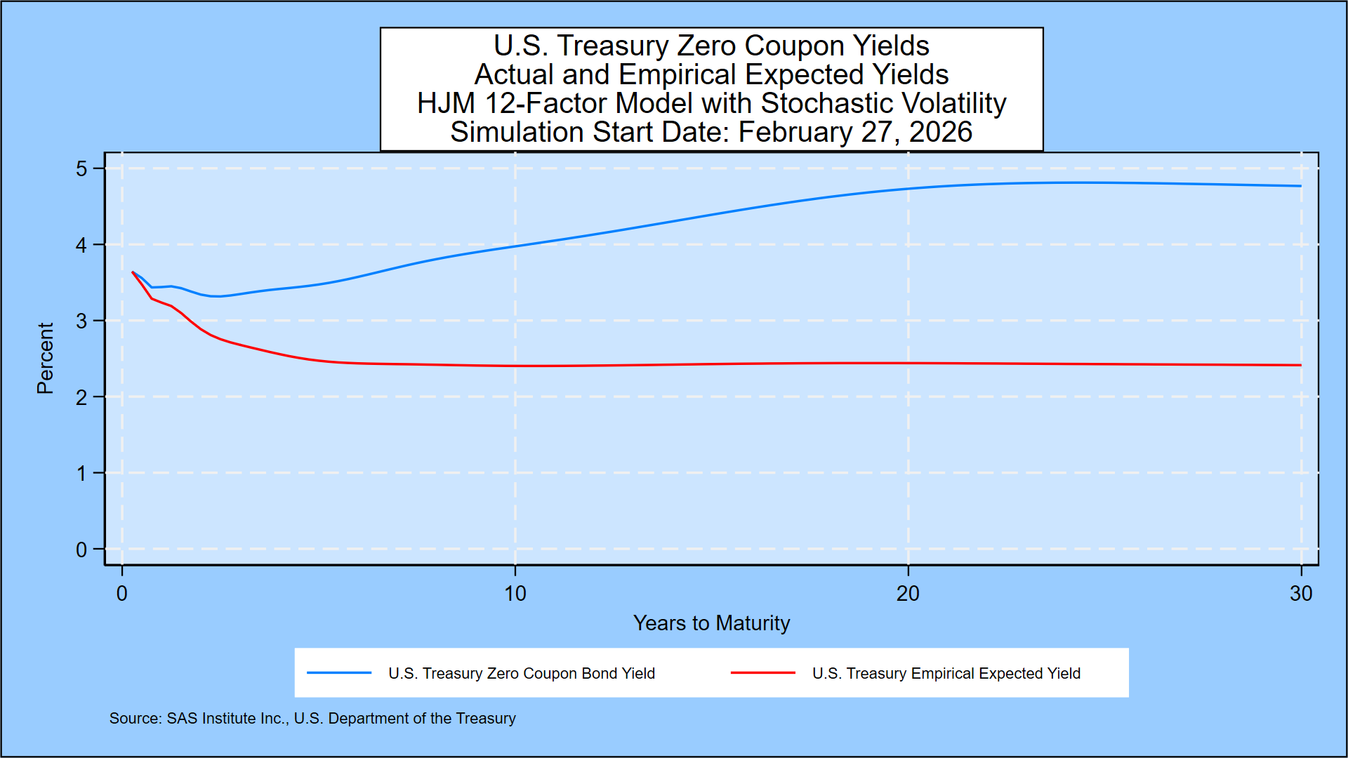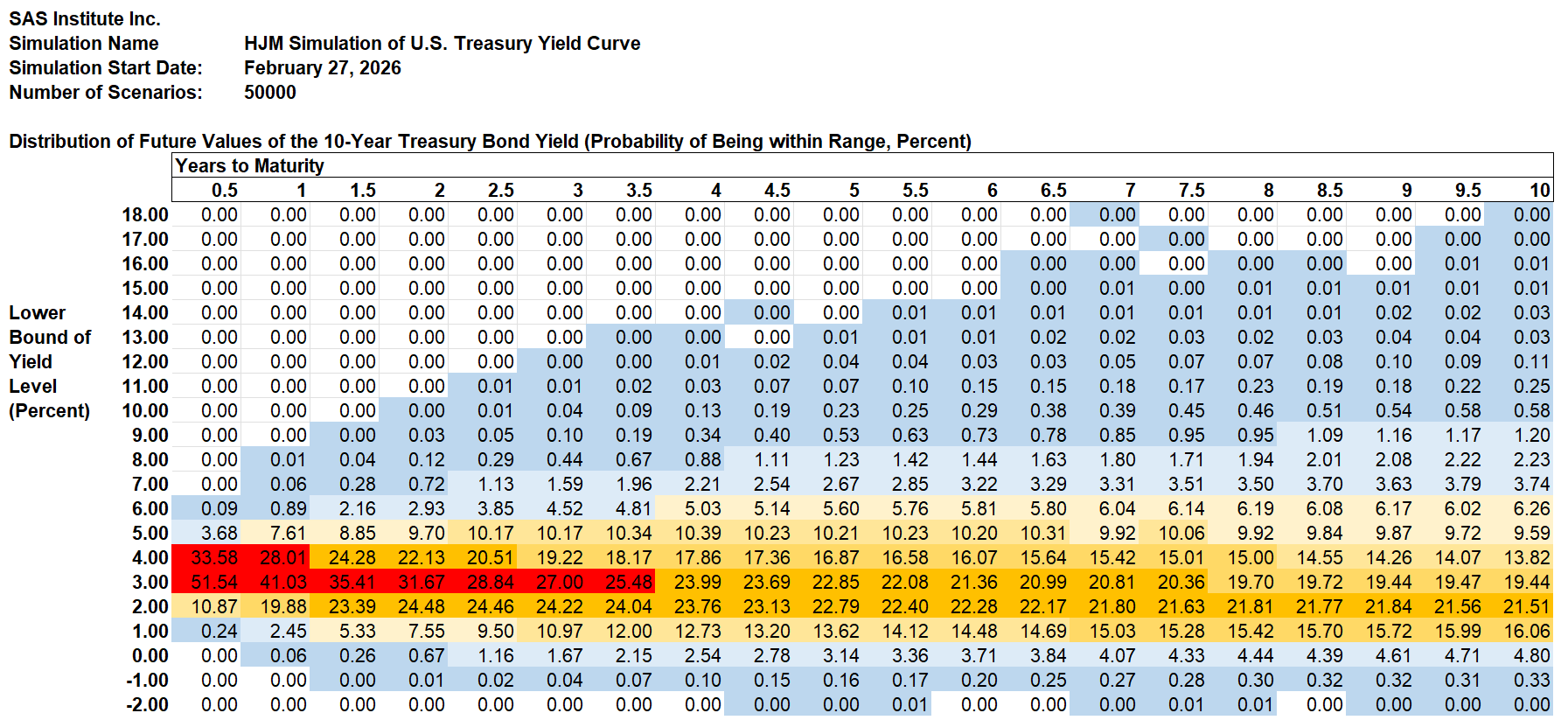 The Treasury yield probabilities are derived using the same methodology that SAS Institute Inc. recommends to its KRIS® and SAS ALM/Kamakura Risk Manager® clients. A moderately technical explanation is given later in the appendix, but we summarize it in plain English first.