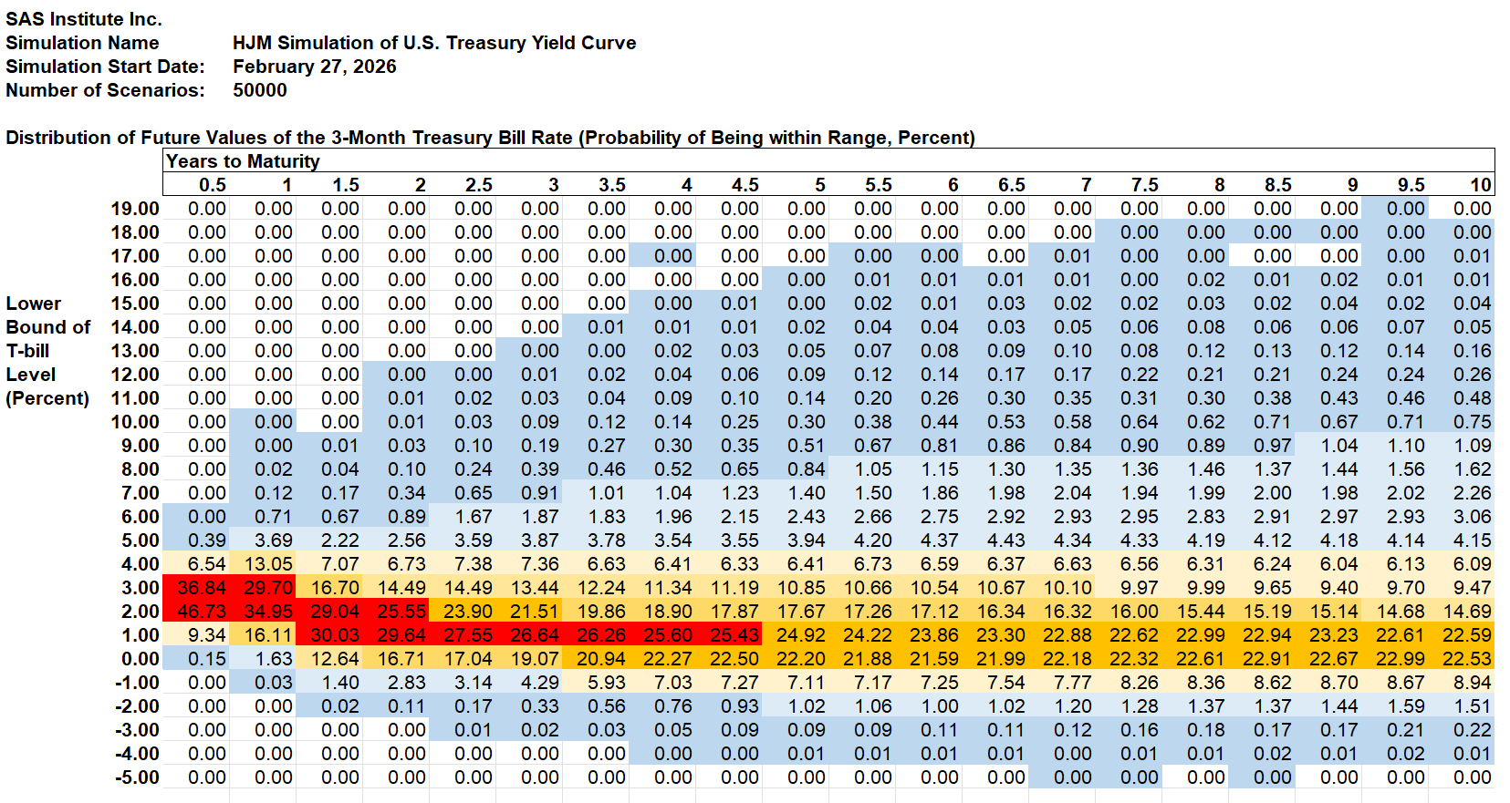 The probability that the 3-month Treasury bill yield will be between 1% and 2% in 2 years is shown in column 4: 29.64%. The probability that the 3-month Treasury bill yield will be negative (as it has been often in Europe and Japan) in 2 years is 2.83% plus 0.11% plus 0.00% = 2.94% (difference due to rounding). Cells shaded in blue represent positive probabilities of occurring, but the probability has been rounded to the nearest 0.01%. The shading scheme is defined as follows: