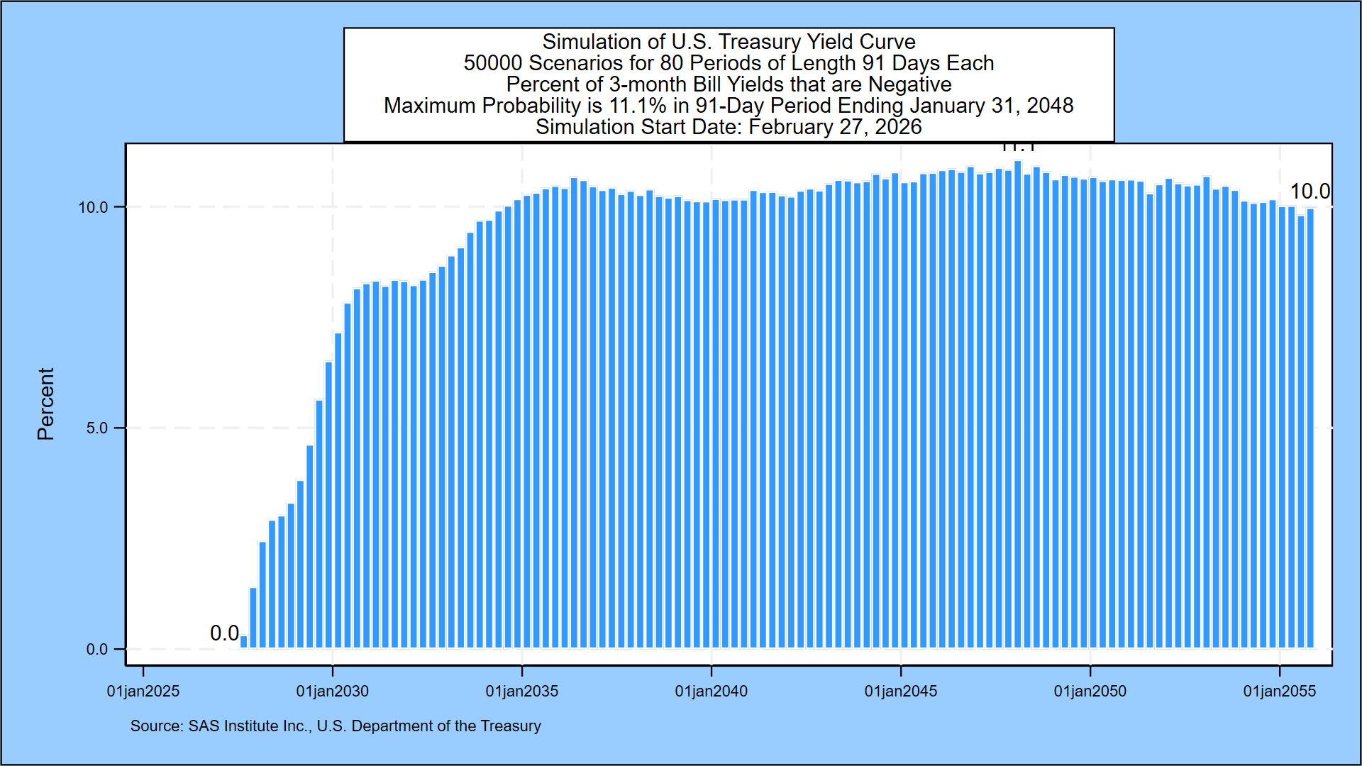 The next graph describes the probability of negative 3-month Treasury bill rates for all but the first 3 months of the next three decades. The probability of negative rates starts near zero and then peaks at 11.1% in the 91-day period ending January 31, 2048.