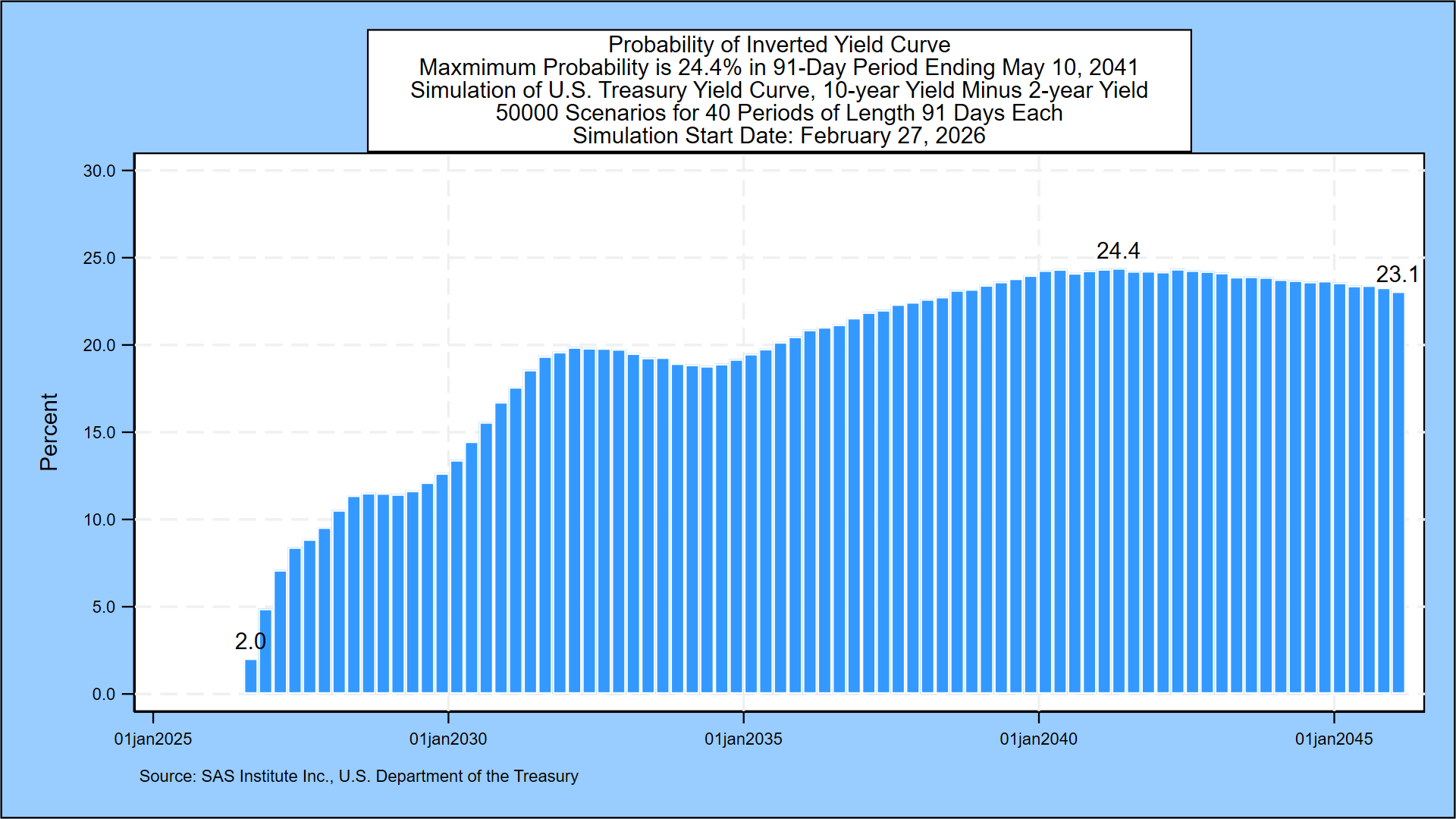 - The maximum probability that the 2-year/10-year Treasury spread is negative in the coming ten years is 24.4% in the 91-day period ending May 10, 2041, compared to 24.6% last week.