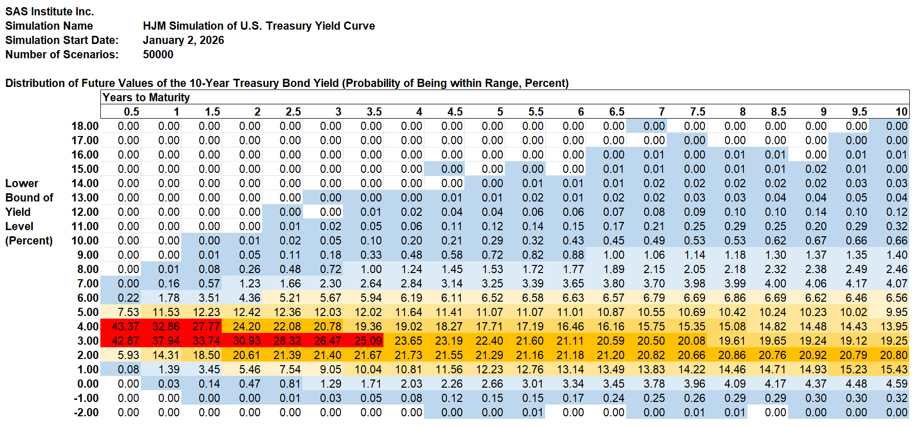 The Treasury yield probabilities are derived using the same methodology that SAS Institute Inc. recommends to its KRIS® and SAS ALM/Kamakura Risk Manager® clients. A moderately technical explanation is given later in the appendix, but we summarize it in plain English first.