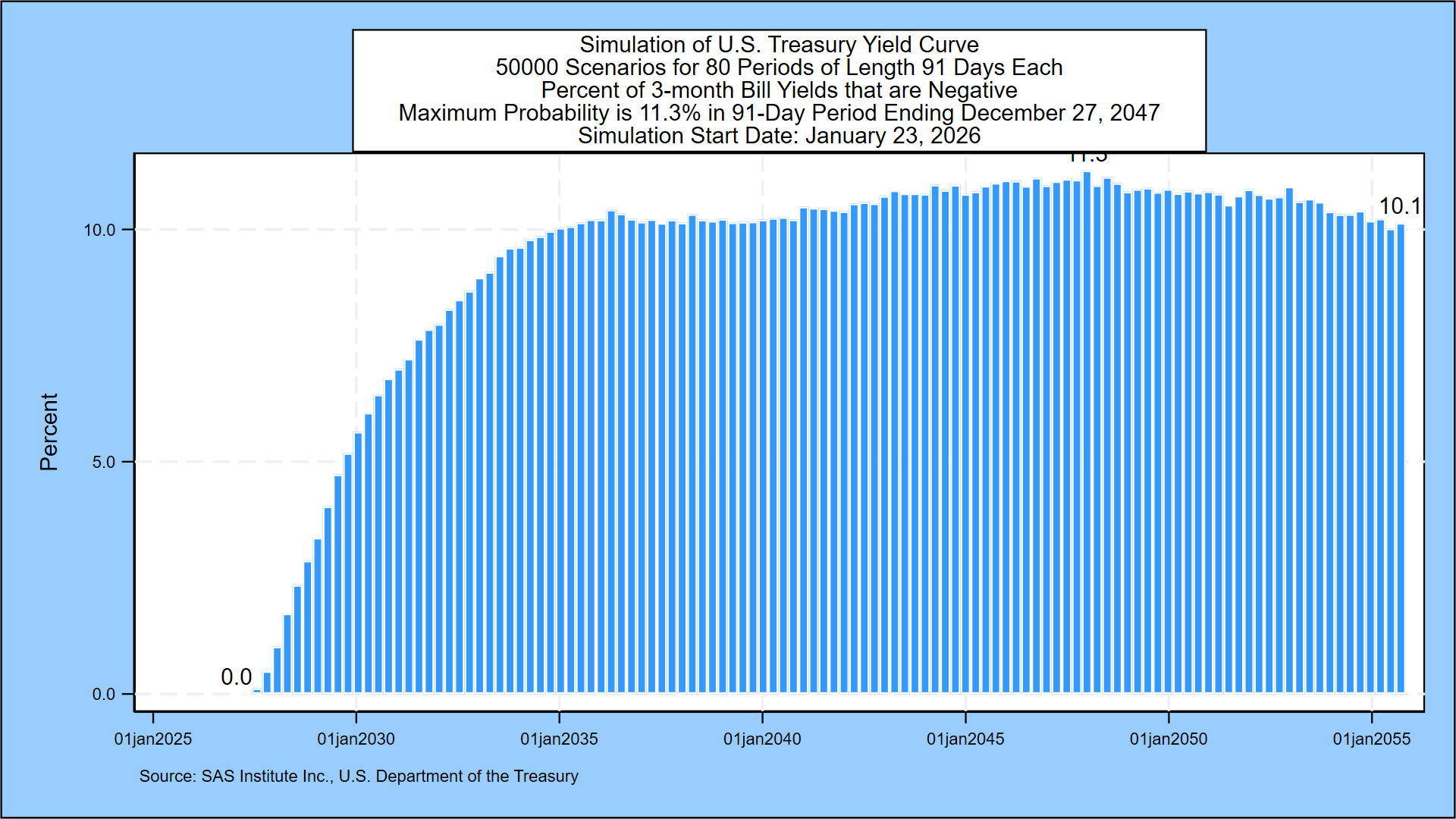 The next graph describes the probability of negative 3-month Treasury bill rates for all but the first 3 months of the next three decades. The probability of negative rates starts near zero and then peaks at 11.3% in the 91-day period ending December 27, 2047.