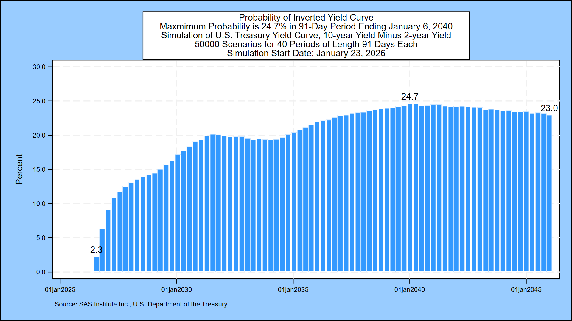 - The maximum probability that the 2-year/10-year Treasury spread is negative in the coming ten years is 24.7% in the 91-day period ending January 6, 2040, compared to 24.7% last week.