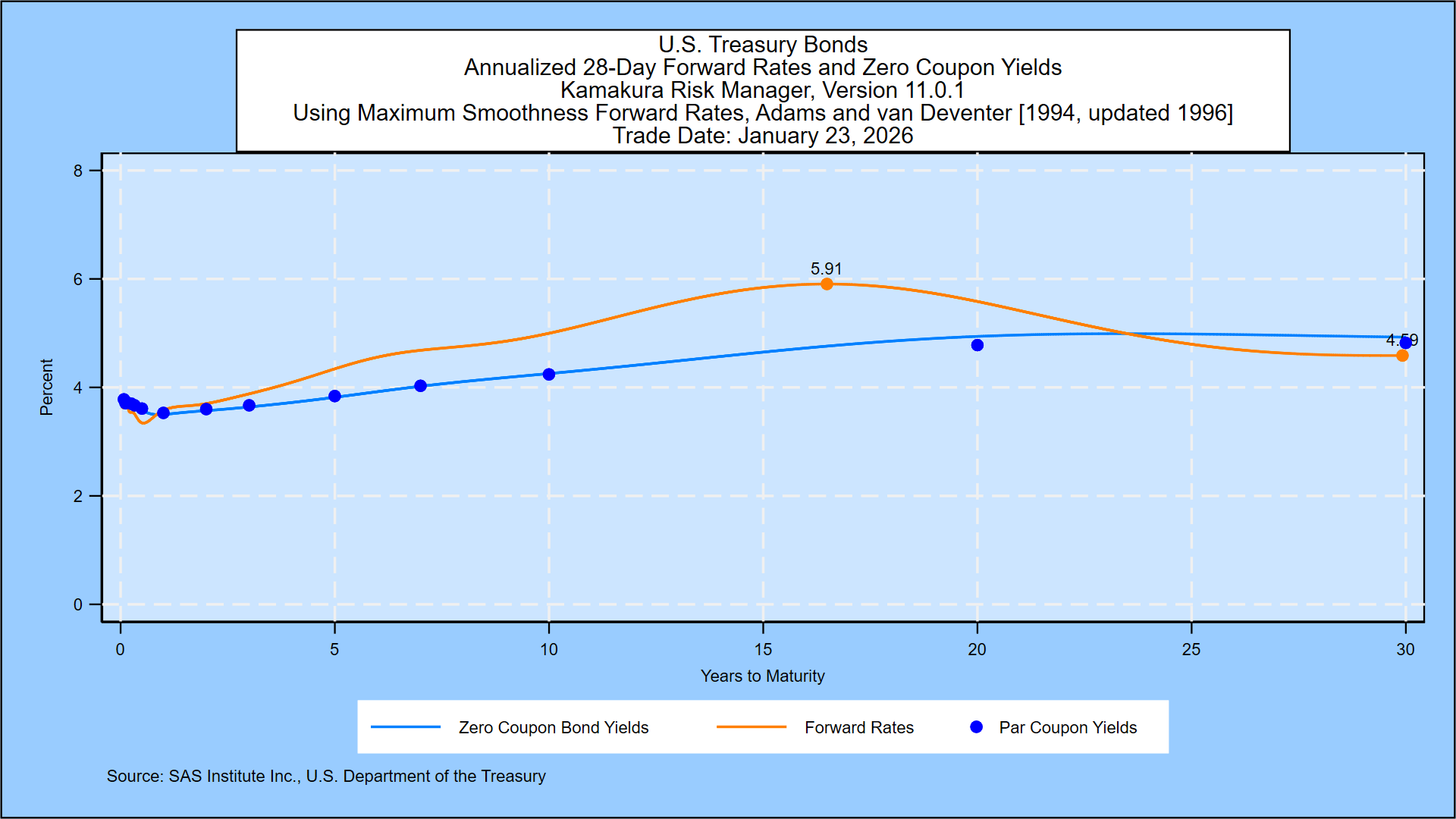 We start from the closing U.S. Treasury yield curve published daily by the U.S. Department of the Treasury. Using a maximum smoothness forward rate approach, Friday’s implied forward rate curve shows the shortest maturity 1-month forward rates at 3.78%, versus 3.75% last week. There is a decline followed by a gradual rise until rates peak at 5.91%, compared to 5.97% the previous week. Forward rates stabilize at 4.59% at the 30-year horizon, versus 4.56% last week.