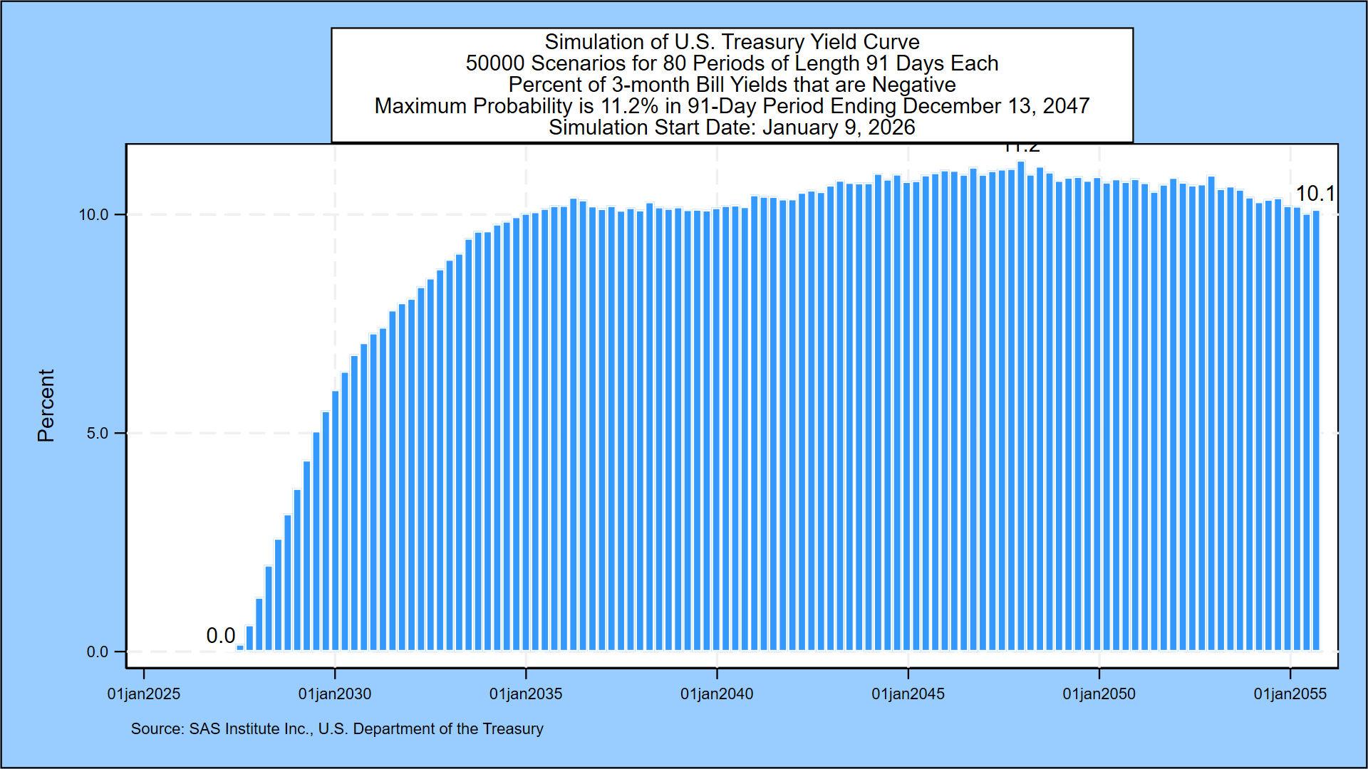 The next graph describes the probability of negative 3-month Treasury bill rates for all but the first 3 months of the next three decades. The probability of negative rates starts near zero and then peaks at 11.2% in the 91-day period ending December 13, 2047.