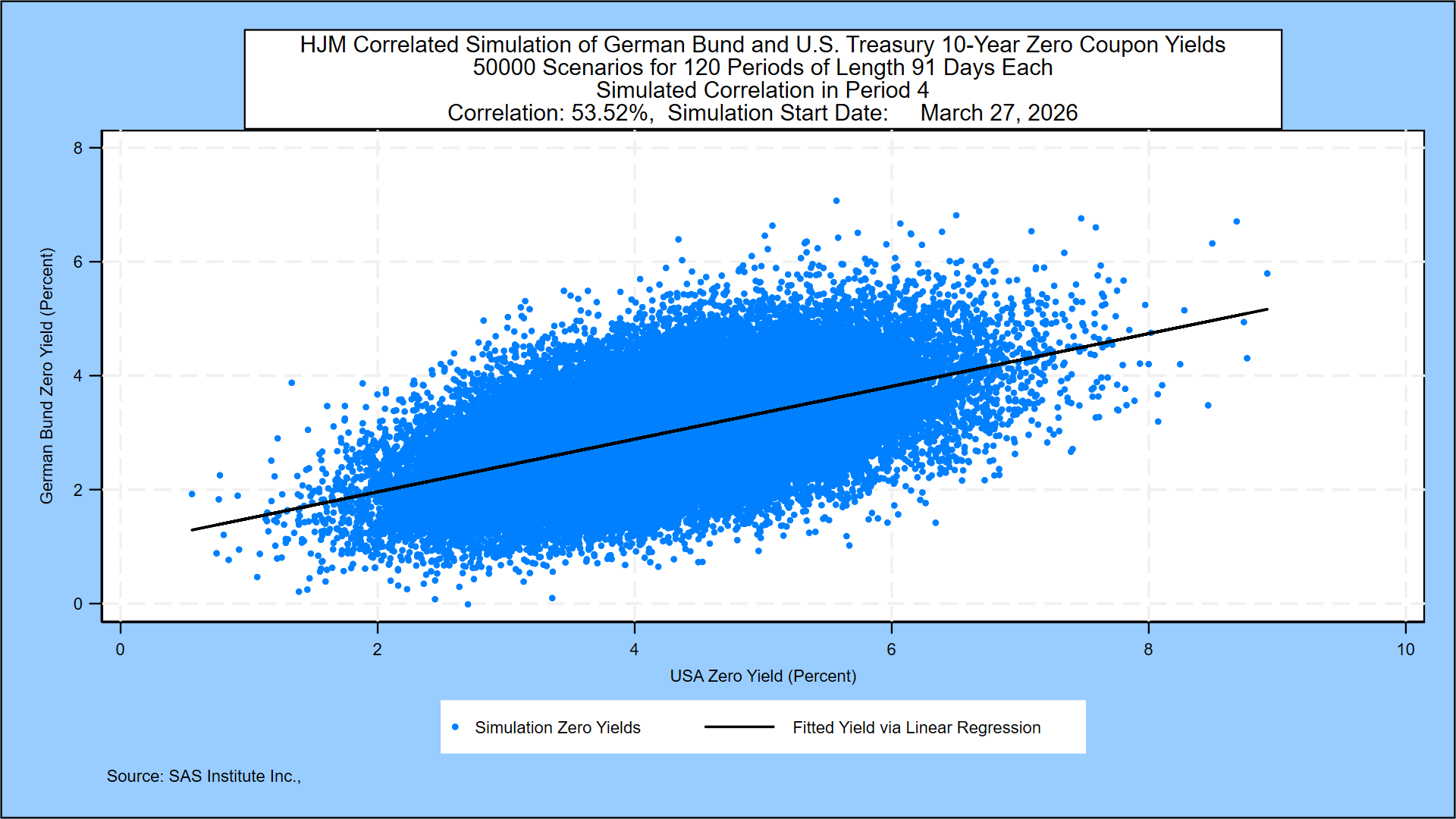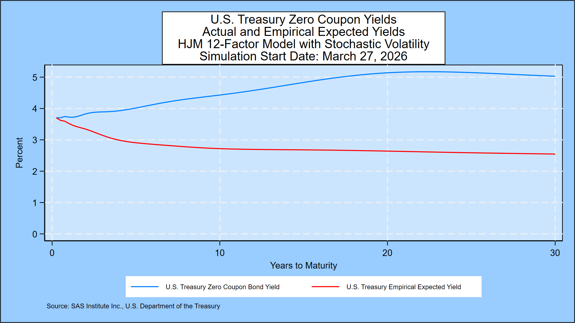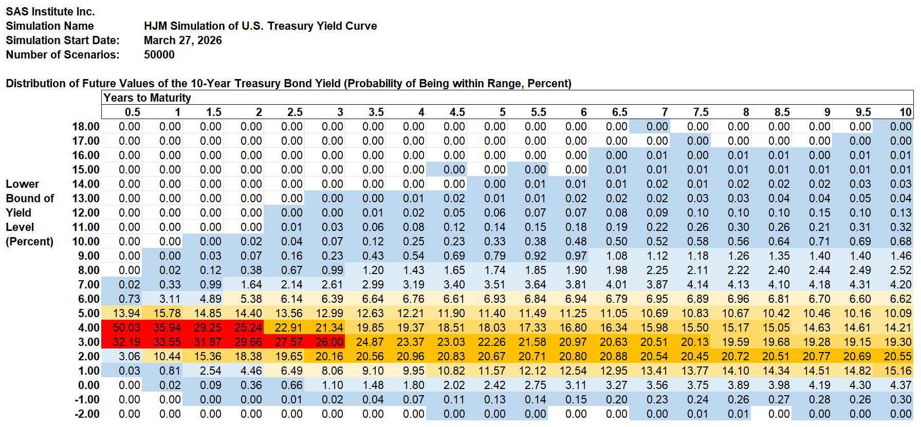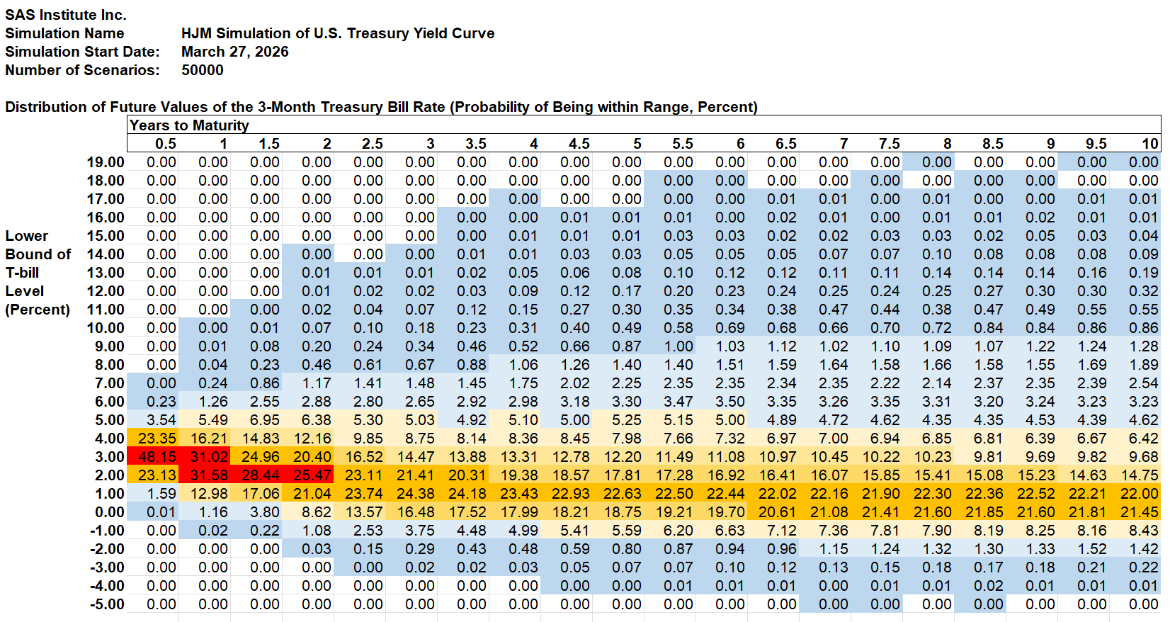 The Treasury yield probabilities are derived using the same methodology that SAS Institute Inc. recommends to its KRIS® and SAS ALM/Kamakura Risk Manager® clients. A moderately technical explanation is given later in the appendix, but we summarize it in plain English first.