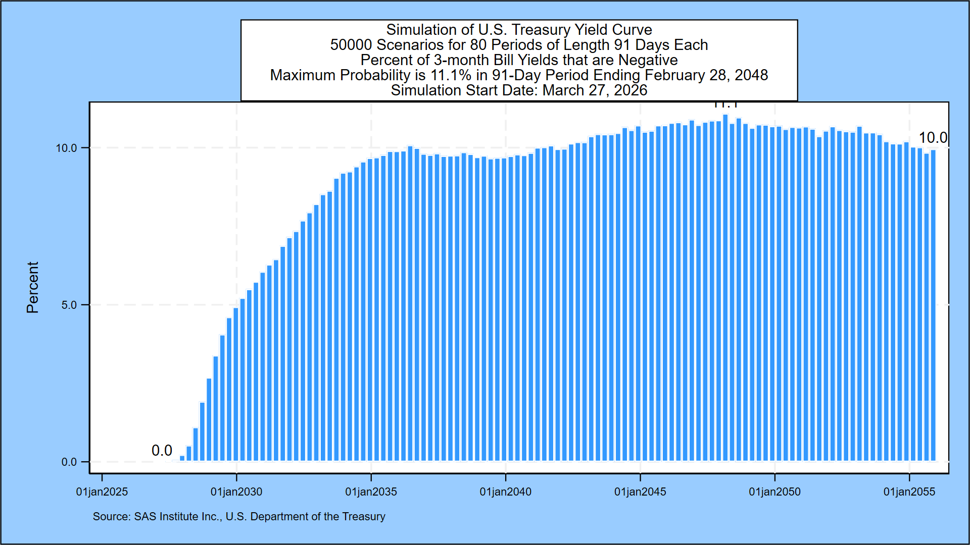 The next graph describes the probability of negative 3-month Treasury bill rates for all but the first 3 months of the next three decades. The probability of negative rates starts near zero and then peaks at 11.1% in the 91-day period ending February 28, 2048.