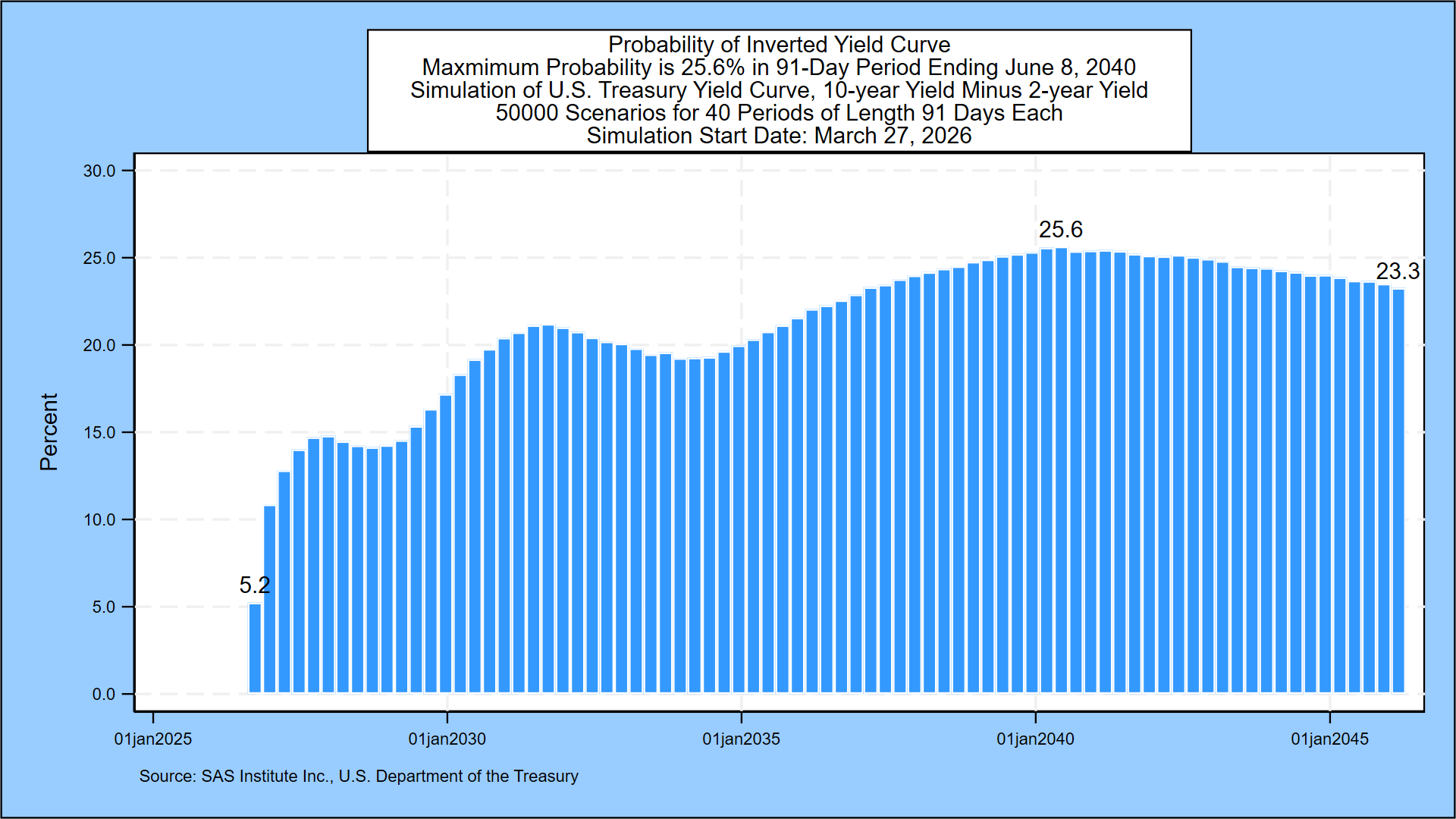 - The maximum probability that the 2-year/10-year Treasury spread is negative in the coming ten years is 25.6% in the 91-day period ending June 8, 2040, compared to 25.7% last week.