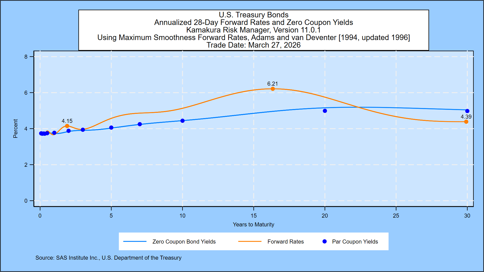 We start from the closing U.S. Treasury yield curve published daily by the U.S. Department of the Treasury. Using a maximum smoothness forward rate approach, Friday’s implied forward rate curve shows the shortest maturity 1-month forward rates at 3.74%, versus 3.73% last week. There is a decline followed by a gradual rise until rates peak at 6.21%, compared to 6.25% the previous week. Forward rates stabilize at 4.39% at the 30-year horizon, versus 4.36% last week.