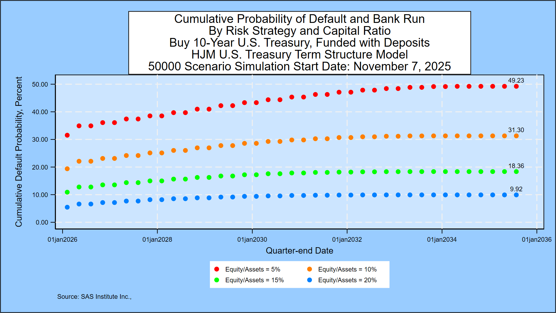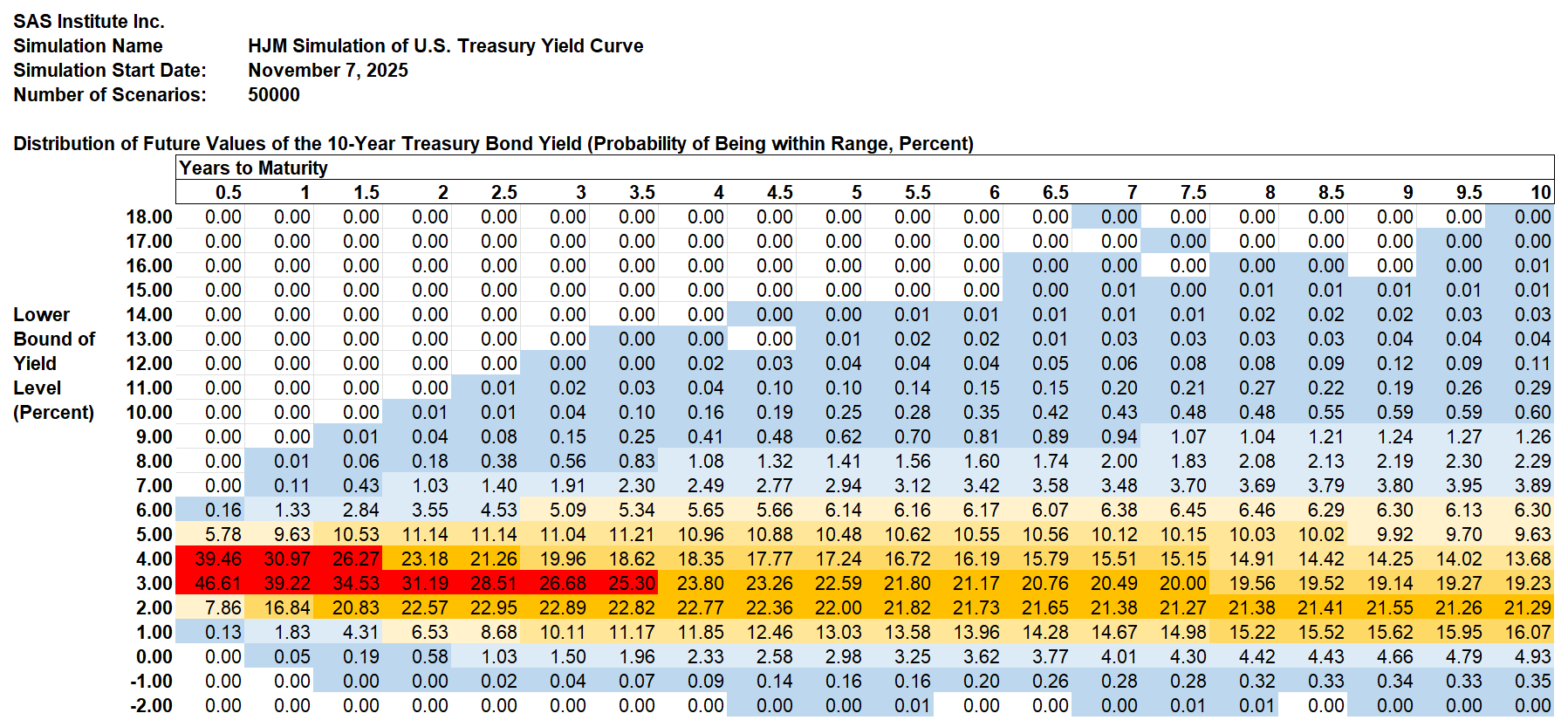 The Treasury yield probabilities are derived using the same methodology that SAS Institute Inc. recommends to its KRIS® and SAS ALM/Kamakura Risk Manager® clients. A moderately technical explanation is given later in the appendix, but we summarize it in plain English first.