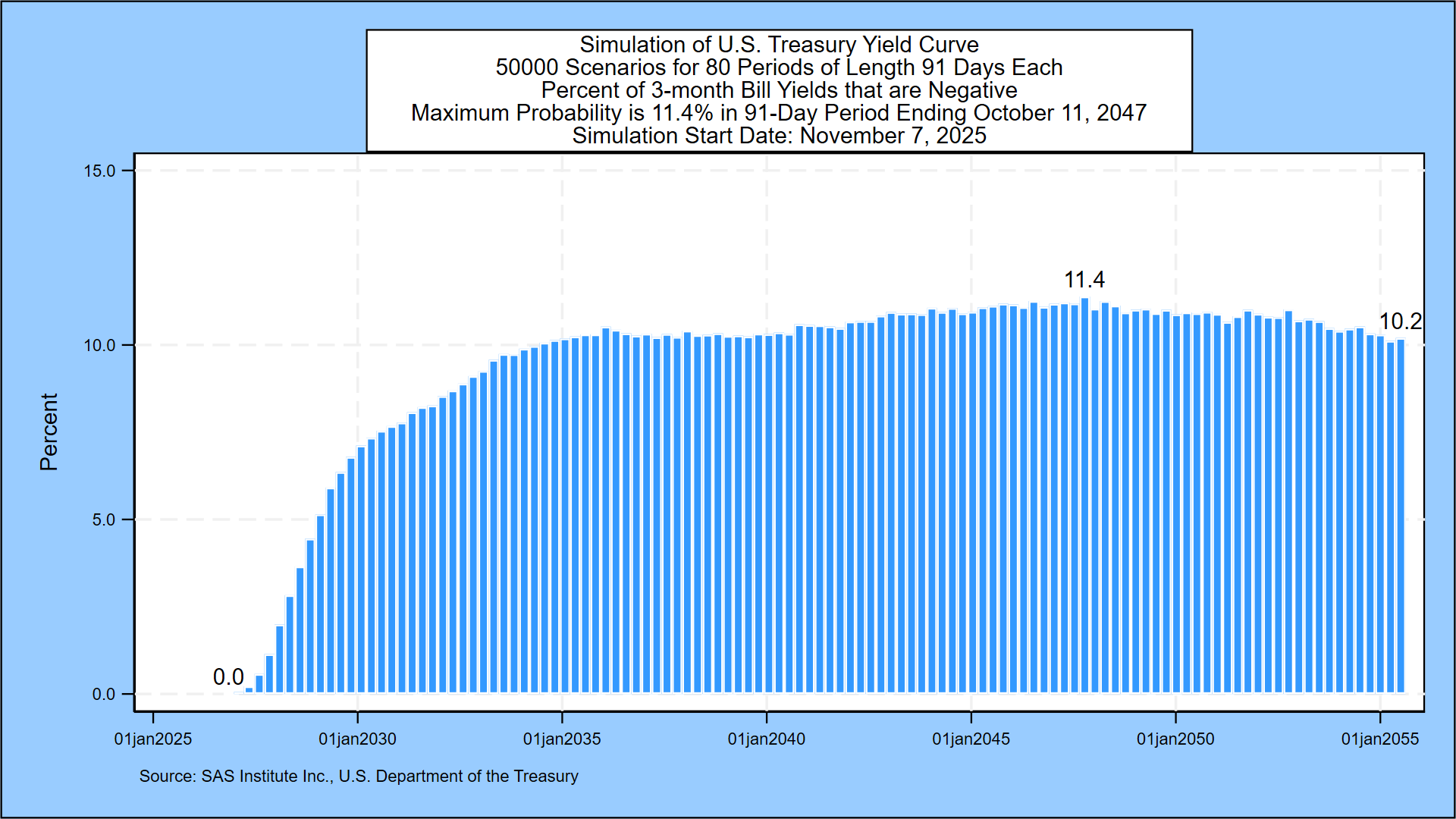 The next graph describes the probability of negative 3-month Treasury bill rates for all but the first 3 months of the next three decades. The probability of negative rates starts near zero and then peaks at 11.4% in the 91-day period ending October 11, 2047.