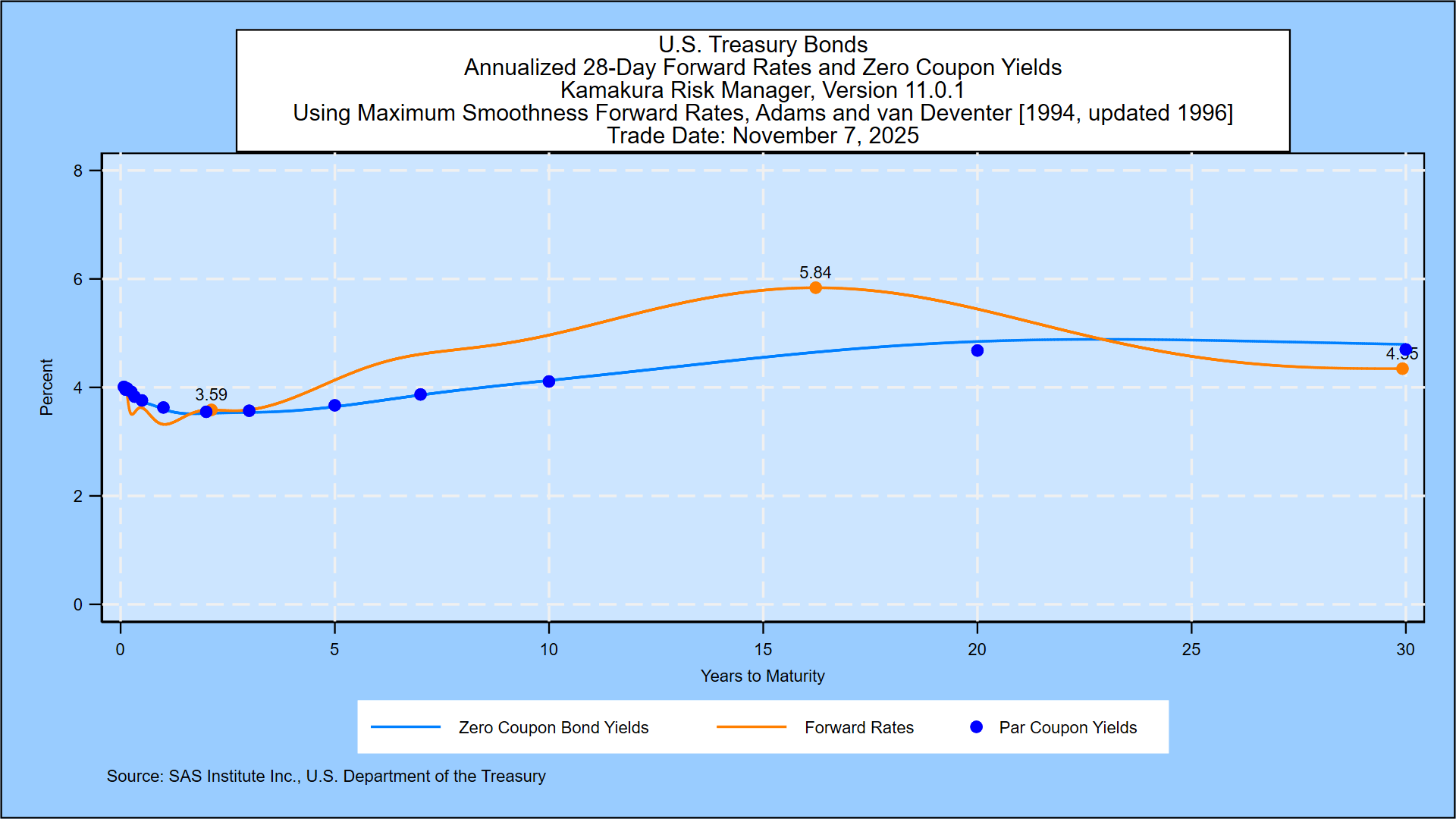 We start from the closing U.S. Treasury yield curve published daily by the U.S. Department of the Treasury. Using a maximum smoothness forward rate approach, Friday’s implied forward rate curve shows the shortest maturity 1-month forward rates at 4.01%, versus 4.06% last week. There is a decline followed by a gradual rise until rates peak at 5.84%, compared to 5.72% the previous week. Forward rates stabilize at 4.35% at the 30-year horizon, versus 4.39% last week.