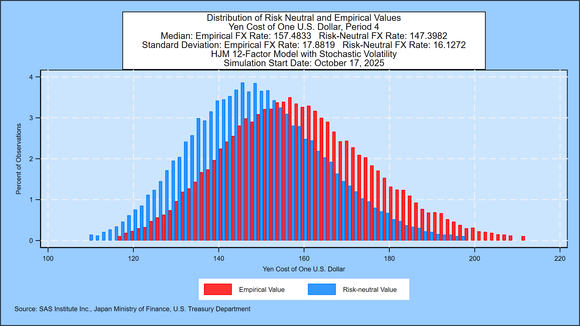 The SAS HJM++© methodology is based on five decades of research by Prof. Robert Jarrow. Using the no-arbitrage conditions of Heath, Jarrow and Morton [1992] and foreign exchange rate no-arbitrage conditions from Amin and Jarrow [1992], foreign exchange rates and government yields in major markets are simulated jointly. The simulation is based on daily movements in government yields and foreign exchange rates since January 2, 1962. The resulting distribution of the yen-U.S. dollar exchange rate one year forward is shown in this graph: