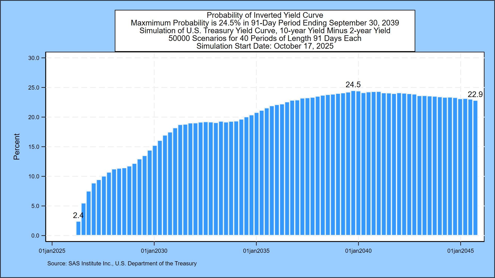 - The maximum probability that the 2-year/10-year Treasury spread is negative in the coming ten years is 24.5% in the 91-day period ending September 30, 2039, unchanged from last week.