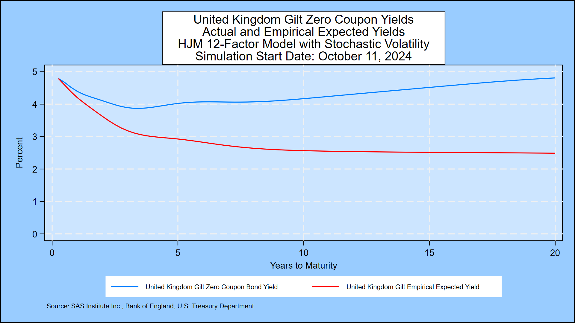 As explained in Prof. Robert Jarrow’s book cited below, forward rates contain a risk premium above and beyond the market’s expectations for the 3-month forward rate. We document the size of that risk premium in the graph below, which shows the zero-coupon yield curve implied by current United Kingdom Gilt prices compared with the annualized compounded yield on 3-month bills that market participants would expect based on the daily movement of government bond yields in 14 countries since 1962. The risk premium, the reward for a long-term investment, is positive and remains so over the full maturity range to 20 years. The graph also shows a steady downward shift in yields in the first three years, as explained below, followed by a gradual rise.
