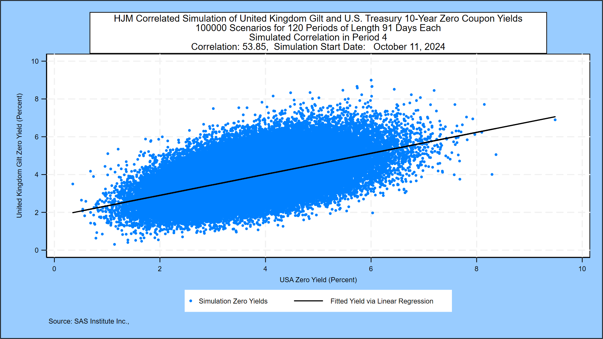 The simulation of the United Kingdom Gilt yield curve and the Pound exchange rate is done simultaneously with simulations of risk-free government yield curves in multiple countries. This simulation is based in daily historical data from 1962 (U.S.), 1974 (Japan), 1979 (United Kingdom), 1997 (Germany) and six other countries. The forward-looking correlation between Gilt and U.S. Treasury 10-year zero coupon yields one year forward is given here: