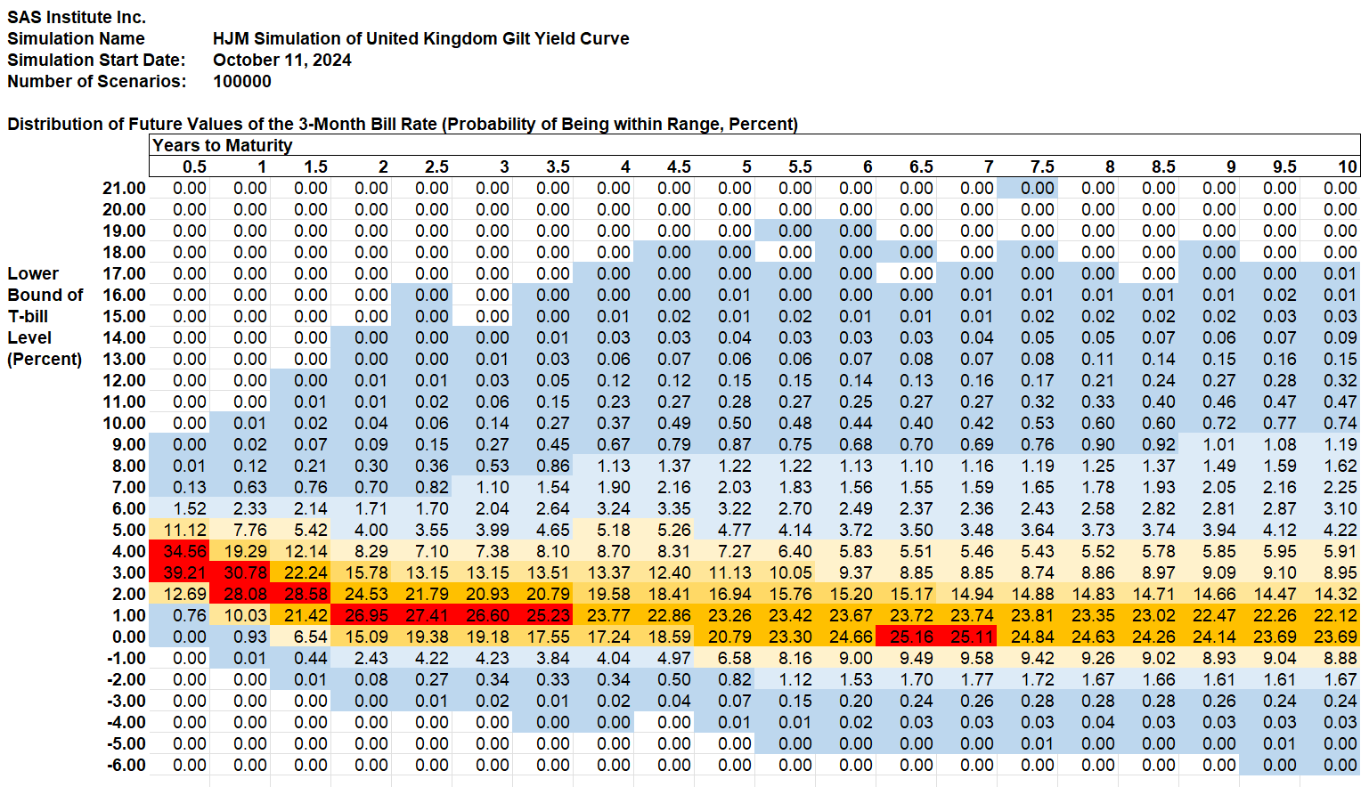 The probability that the 3-month bill yield will be between 1% and 2% in 2 years is shown in column 4: 26.95%. The probability that the 3-month yield will be negative (as it has been often in Europe and Japan) in 2 years 2.43% plus 0.08% plus 0.00% plus 0.00% = 2.51% (difference due to rounding). Cells shaded in blue represent positive probabilities of occurring, but the probability has been rounded to the nearest 0.01%. The shading scheme works like this: