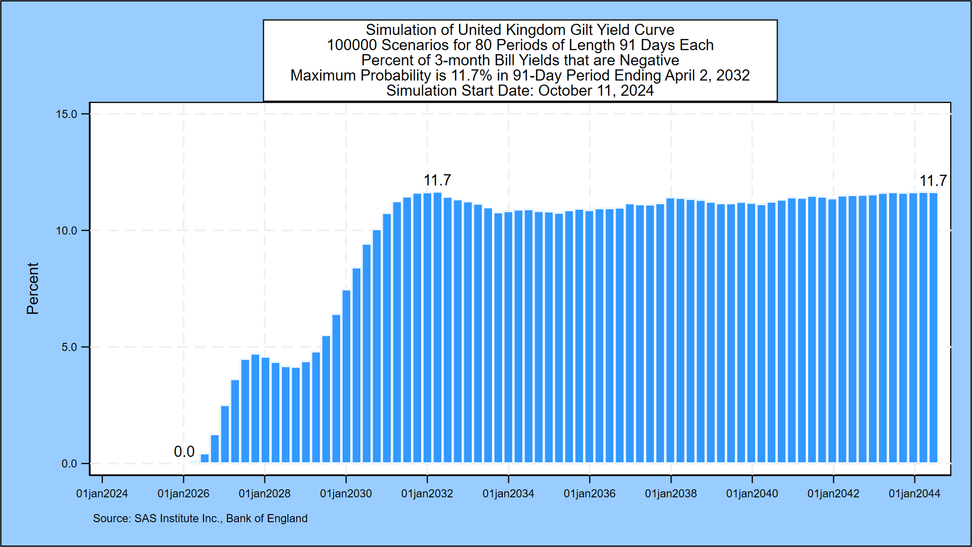 The next graph describes the probability of negative 3-month bill rates for all but the first 3 months of the next two decades. The probability of negative rates starts near zero but peaks at 16.1% in the period ending April 2, 2032.