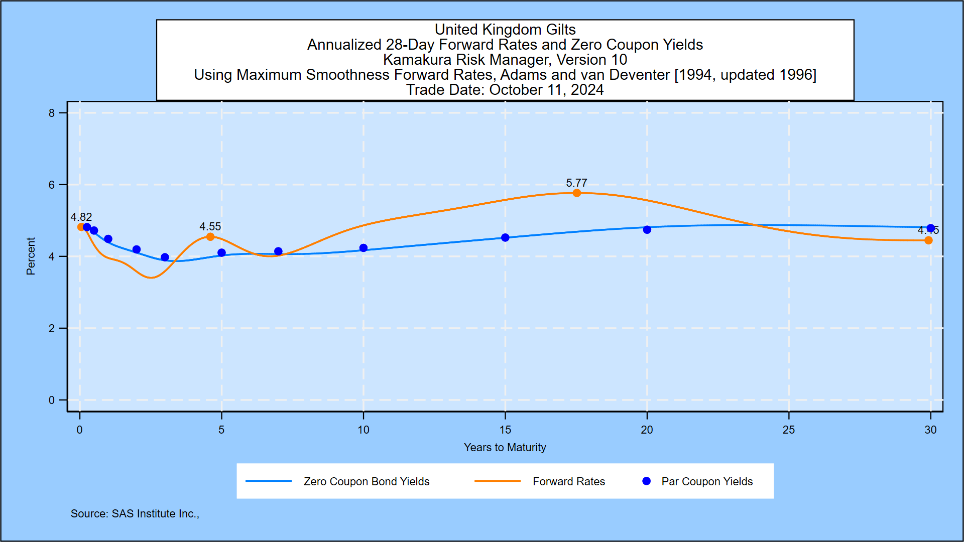 We start from the closing United Kingdom Gilt yield curve published daily by the Bank of England and other information sources. Using a maximum smoothness forward rate approach, Friday’s implied forward rate curve shows 1-month rates at an initial peak of 4.82%. As maturities lengthen, there is some volatility until rates peak again at 5.77%. Forward rates then decline to a lower plateau of 4.15% at the end of the 20-year horizon.