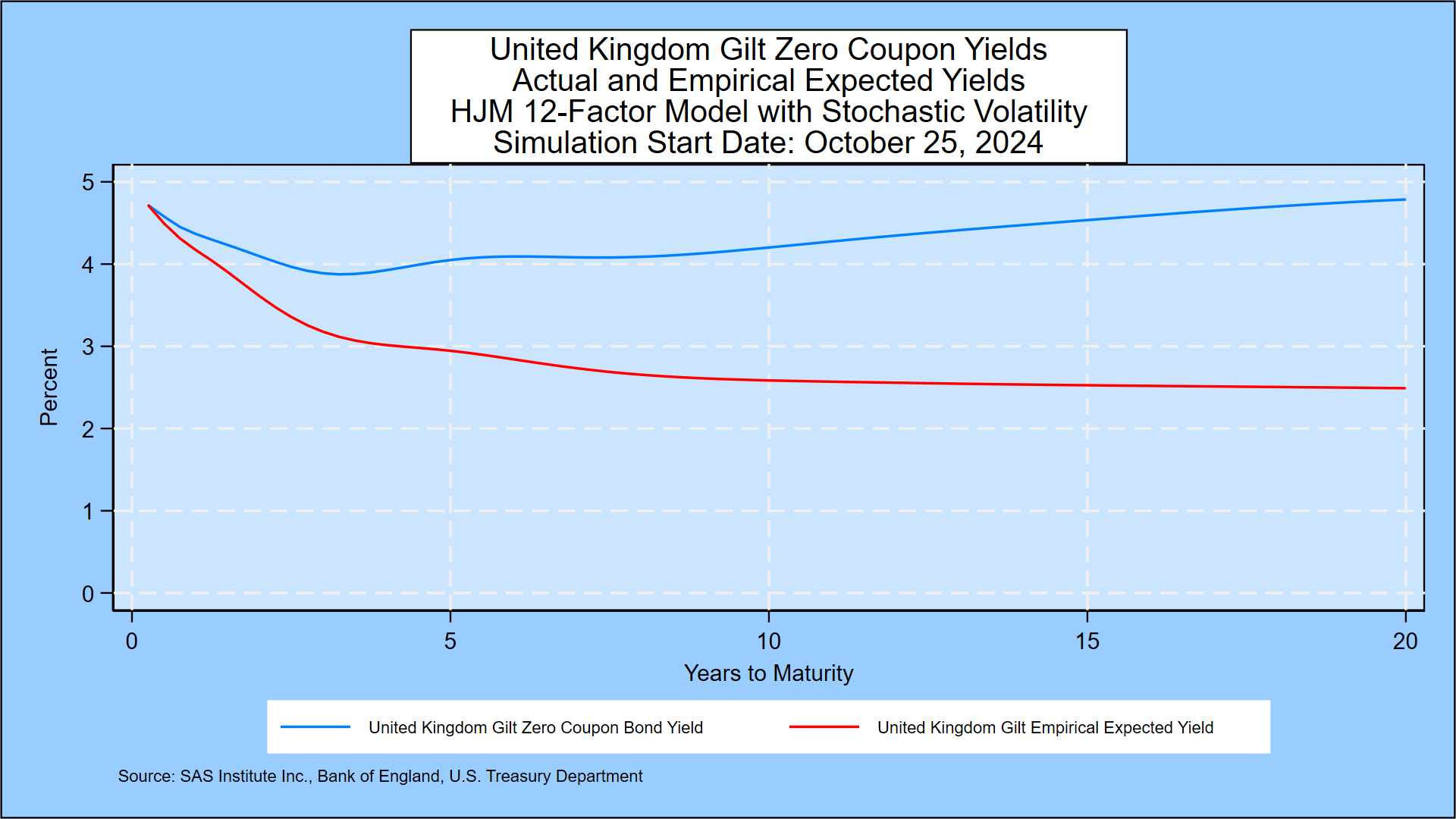As explained in Prof. Robert Jarrow’s book cited below, forward rates contain a risk premium above and beyond the market’s expectations for the 3-month forward rate. We document the size of that risk premium in the graph below, which shows the zero-coupon yield curve implied by current United Kingdom Gilt prices compared with the annualized compounded yield on 3-month bills that market participants would expect based on the daily movement of government bond yields in 14 countries since 1962. The risk premium, the reward for a long-term investment, is positive and remains so over the full maturity range to 20 years. The graph also shows a steady downward shift in current zero-coupon yields in the first three years, as explained below, followed by a gradual rise.