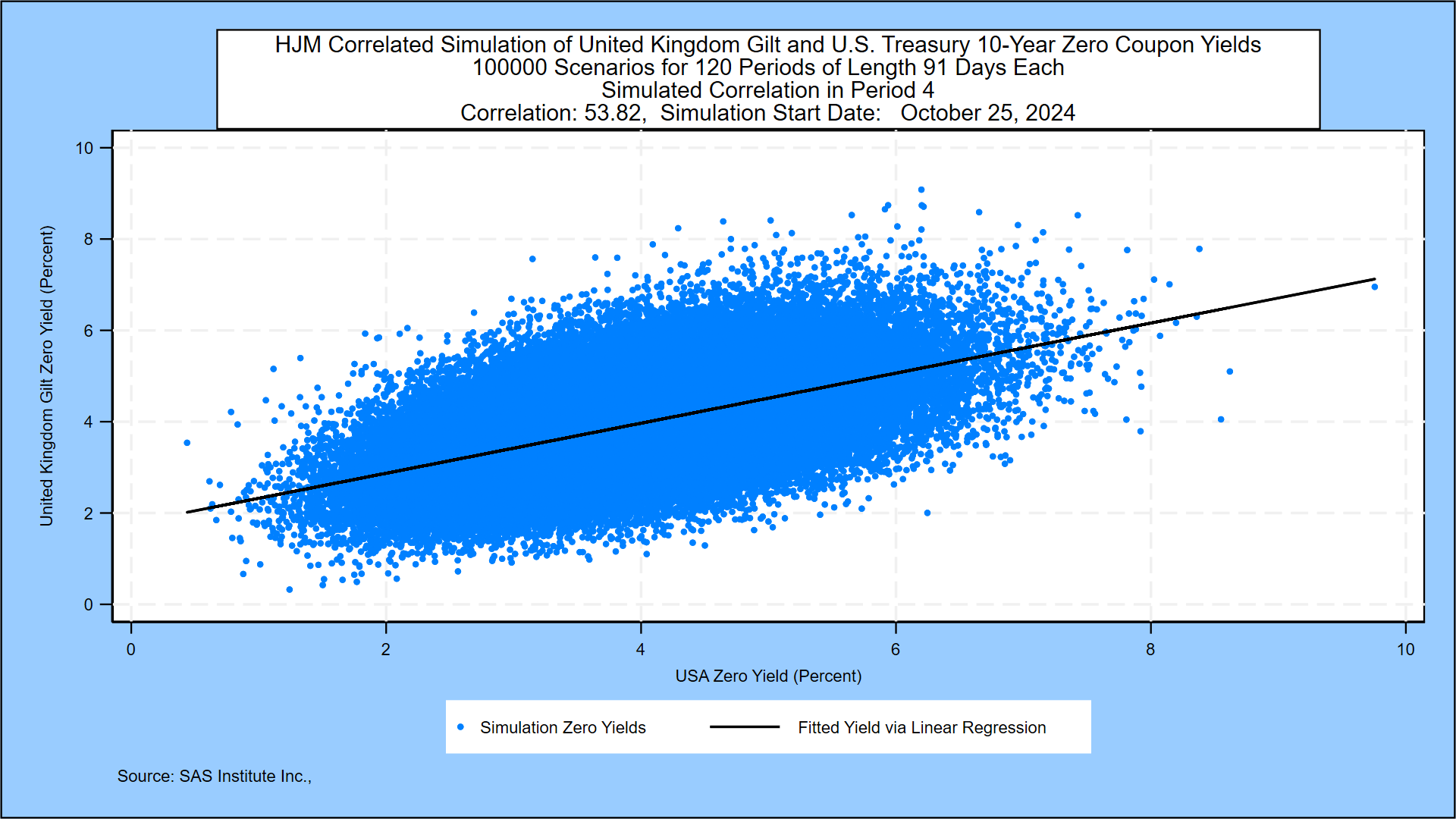 The simulation of the United Kingdom Gilt yield curve and the Pound exchange rate is done simultaneously with simulations of risk-free government yield curves in multiple countries. This simulation is based in daily historical data from 1962 (U.S.), 1974 (Japan), 1979 (United Kingdom), 1997 (Germany) and six other countries. The forward-looking correlation between Gilt and U.S. Treasury 10-year zero coupon yields one year forward is given here: