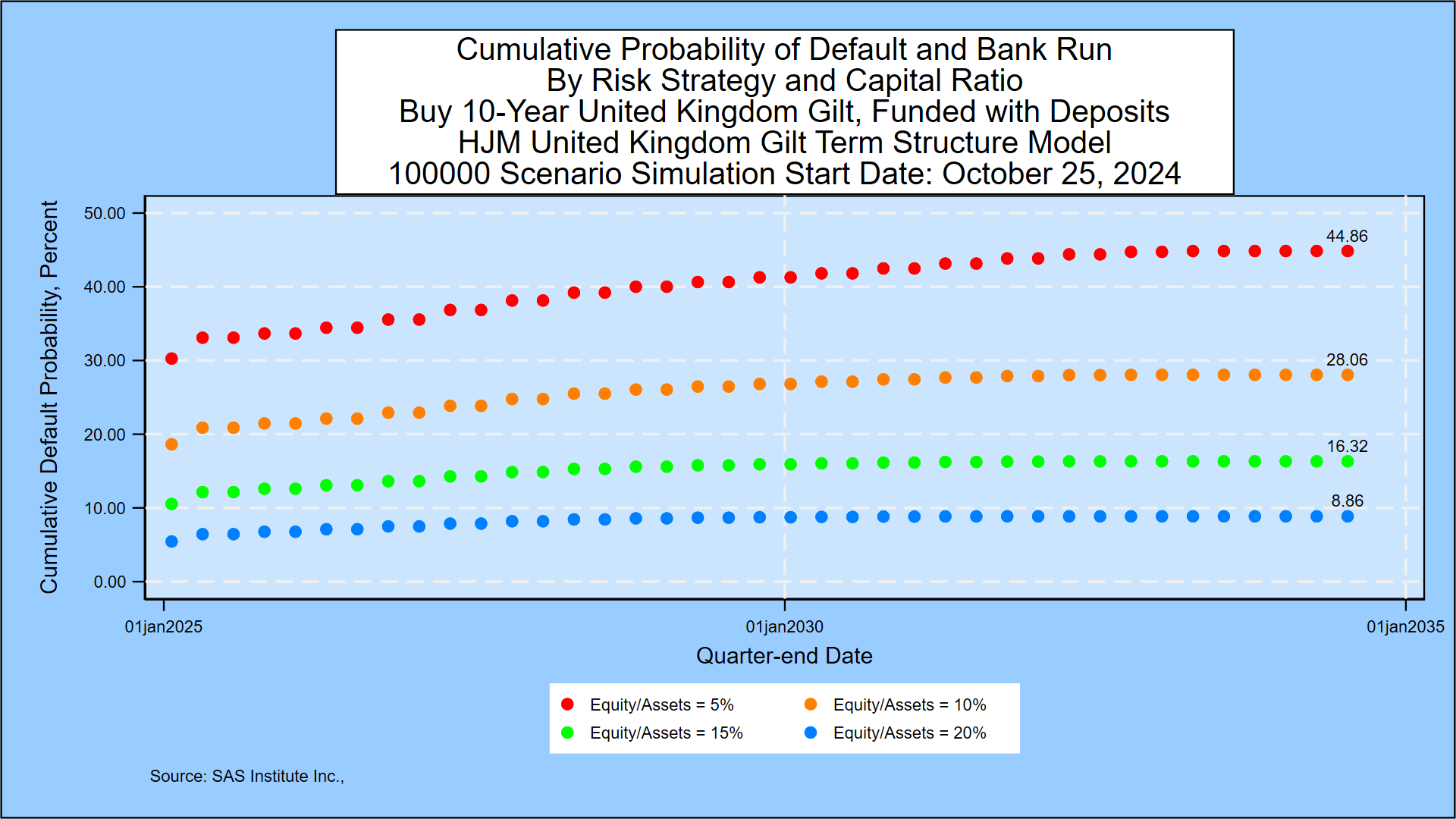 In light of the interest-rate-risk-driven failure of Silicon Valley Bank in the United States on March 10, 2023, we have added a table that applies equally well to banks, institutional investor, and individual investor mismatches from buying long-term United Kingdom Gilts with borrowed short-term funds. We assume that the sole asset is a 10-year United Kingdom Gilt purchased at time zero at par value of 100 Pounds. We analyze default risk for four different initial market values of equity to market value of asset ratios: 5%, 10%, 15%, and 20%. For the banking example, we assume that the only class of liabilities is deposits that can be withdrawn at par at any time. In the institutional and retail investor case, we assume that the liability is essentially a borrowing on margin/repurchase agreement with the possibility of margin calls. For all investors, the amount of liabilities (95, 90, 85 or 80) represents a “strike price” on a put option held by the liability holders. Failure occurs via a margin call, bank run, or regulatory takeover (in the banking case) when the value of assets falls below the value of liabilities.