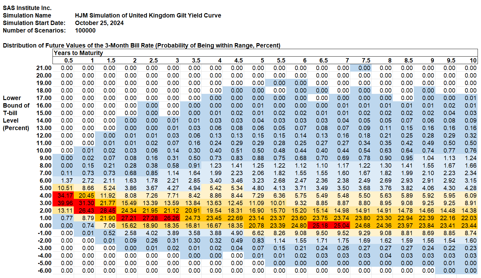 The probability that the 3-month bill yield will be between 1% and 2% in 2 years is shown in column 4: 27.21%. The probability that the 3-month yield will be negative (as it has been often in Europe and Japan) in 2 years 2.58% plus 0.09% plus 0.00% plus 0.00% = 2.67% (difference due to rounding). Cells shaded in blue represent positive probabilities of occurring, but the probability has been rounded to the nearest 0.01%. The shading scheme works like this: