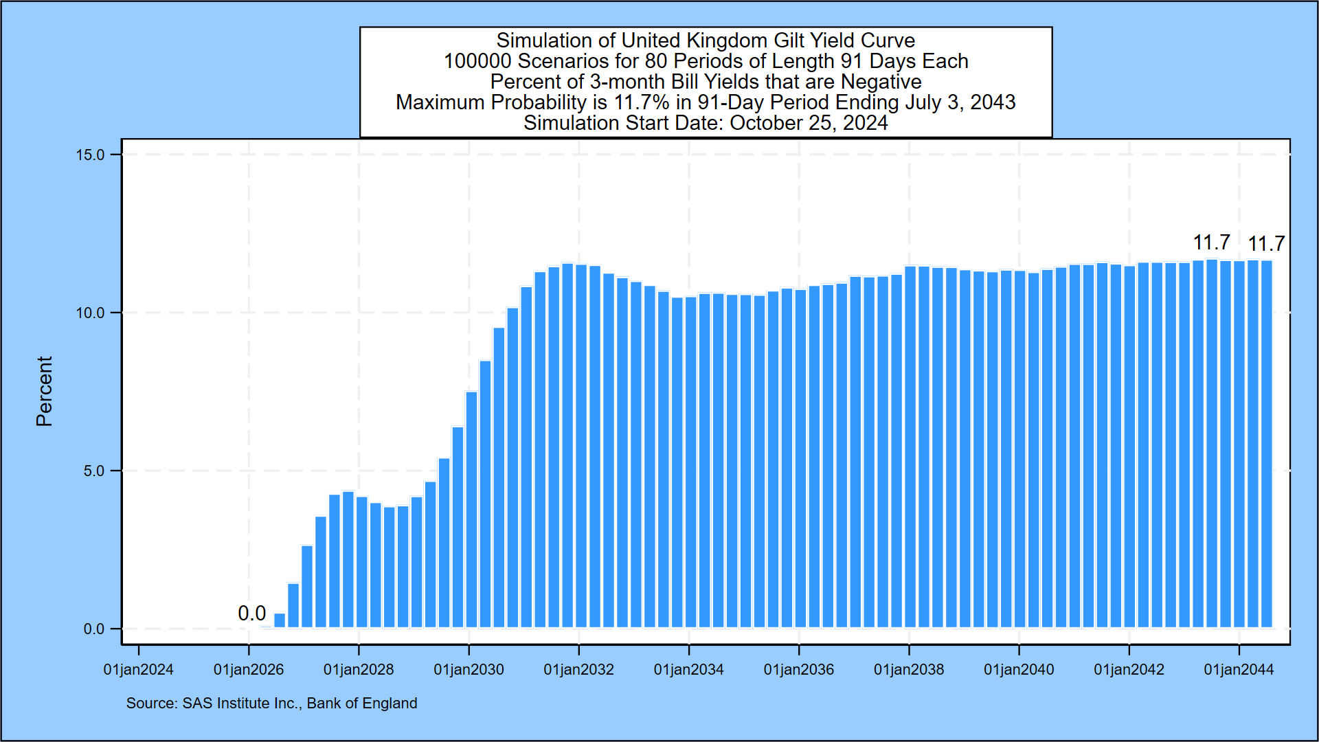 The chart below shows the same probabilities for the 10-year Gilt yield derived as part of the same simulation.