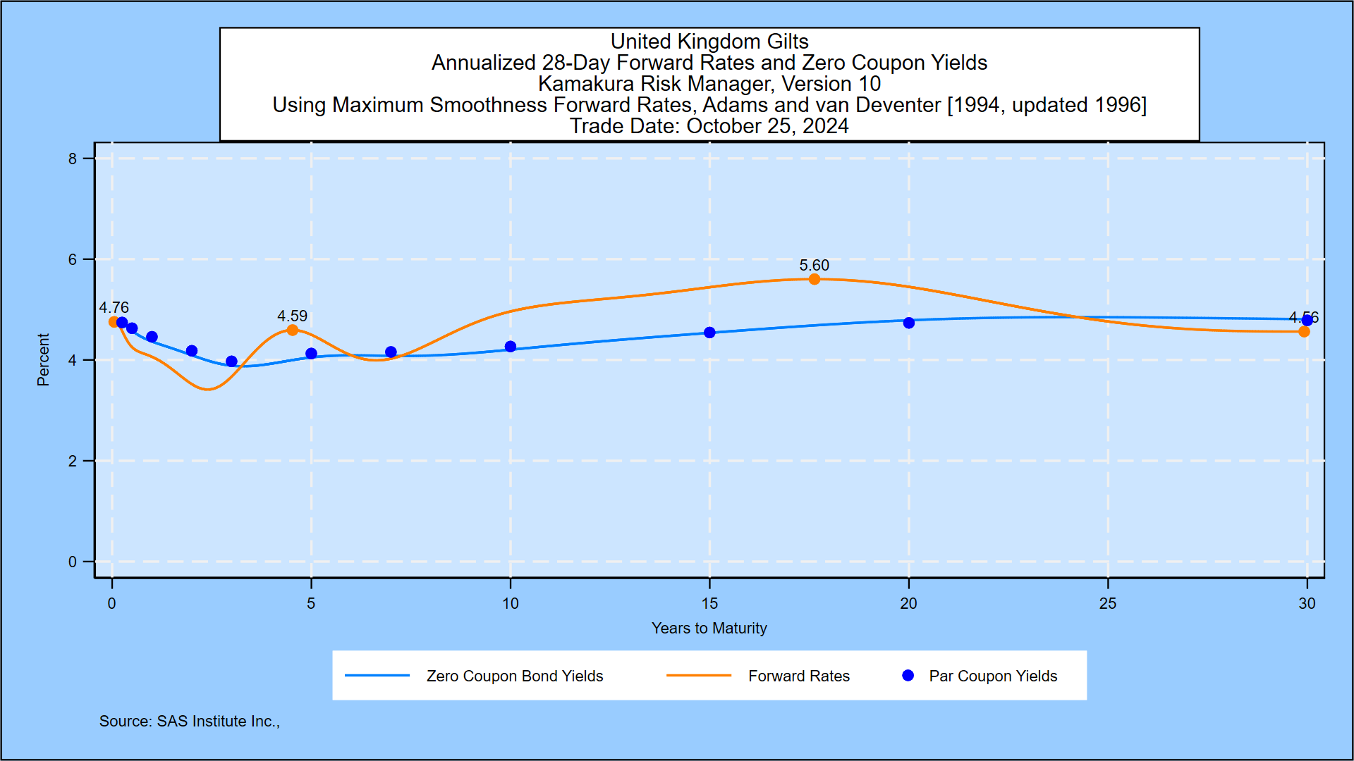 We start from the closing United Kingdom Gilt yield curve published daily by the Bank of England and other information sources. Using a maximum smoothness forward rate approach, Friday’s implied forward rate curve shows 1-month rates at an initial peak of 4.76%, compared to 4.79% last week. As maturities lengthen, there is some volatility until rates peak again at 5.60%, compared to 5.37% last week. Forward rates then decline to a lower plateau of 4.56%, versus 4.64% last week, at the end of the 30-year horizon.